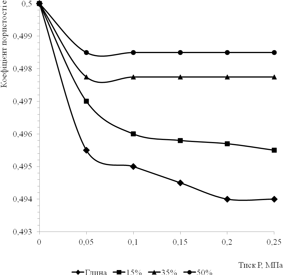 У лабораторних умовах було досліджено залежність зміни коефіцієнта пористості глинистого ґрунту від вмісту в ньому активного мулу, який змінювався від 15 до 50 %.