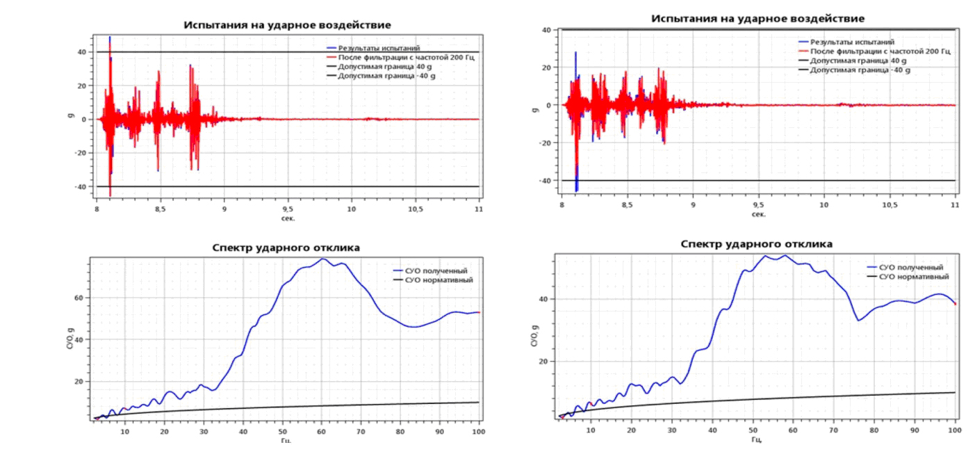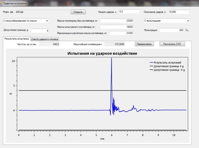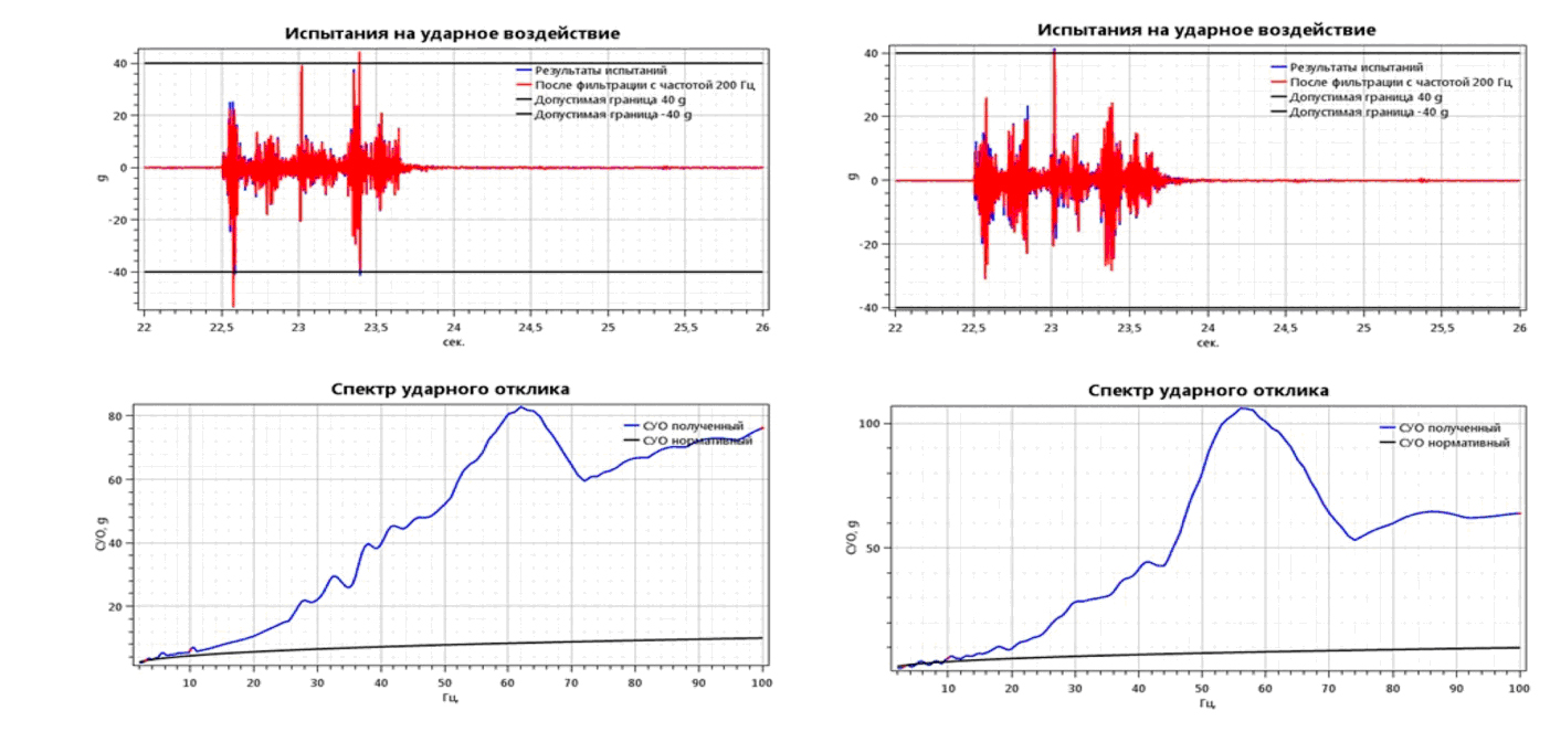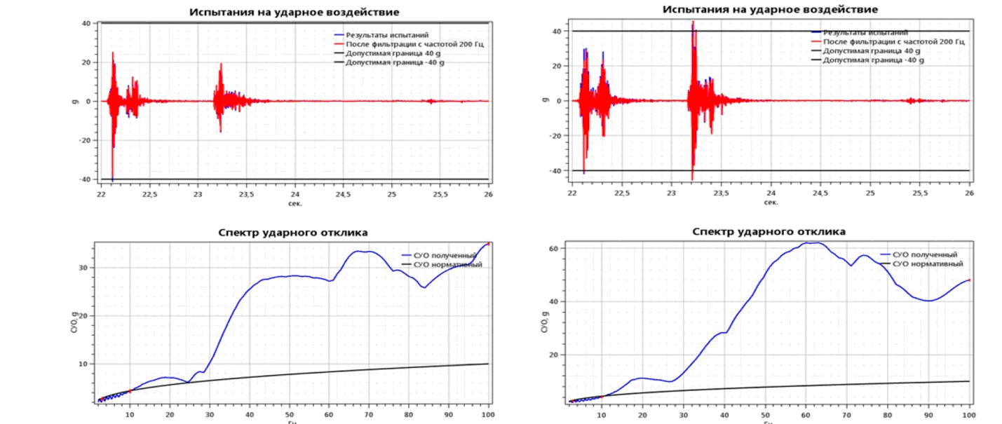 Согласно п. 41.3.3.2 нормативного документа [12] минимальный диапазон амплитуды – 200 g, максимальный нижний предел частот – 1 Гц и минимальный верхний предел частот – 3 000 Гц, а аналого-цифровая система сбора данных должна обеспечивать минимальную частоту дискретизации регистрируемых процессов – 1 000 Гц. В систему сбора данных включается аналоговый фильтр нижних частот с частотой среза 200 Гц.