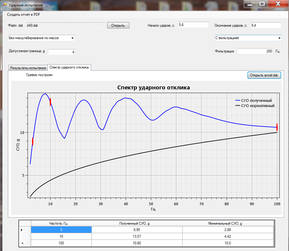 d) строится кривая спектра ударного отклика и минимальная СУО.