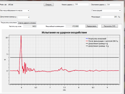 На первый взгляд, наиболее подходящим для этих целей программным продуктом является WinПОС Expert НПП «МЕРА» [10], однако разработчики предпочли создать свой узкоспециализированный программный продукт, зафиксировав все необходимые параметры измерительно-регистрирующей среды и настроенный на получение графической и текстовой входной и выходной информации, адаптированной к существующей нормативно-технической документации. В качестве алгоритмического языка программирования был выбран СИ-шарп (С#), и тем самым, помимо простоты и удобства использования программного продукта, была обеспечена его открытость и возможность адаптации к меняющимся требованиям по обработке данных ударных процессов.