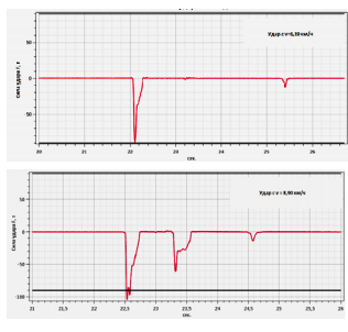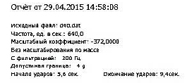 b) выбран фрагмент записи (рис. 2), соответствующий нормативным требованиям – «Начало ударов» (до 0,05 с до удара) и «Окончание ударов» (2,0 с после удара);