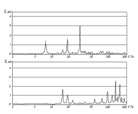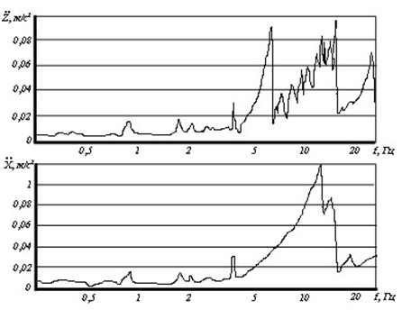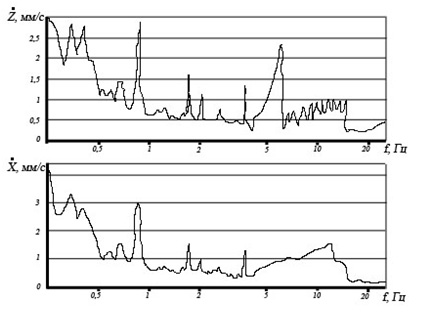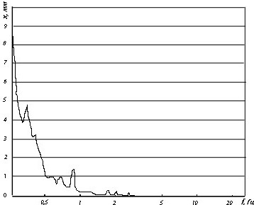 Интегрирование спектрограммы скоростей (рис. 3) позволило установить значения амплитуд колебаний нижних опор в областях рабочих частот машины. Амплитуды перемещений находятся в диапазоне 0,2…0,3 мм и безопасны для конструкции машины. Амплитуды колебаний на частотах менее 1,5 Гц малодостоверны из-за двойного интегрирования исходного сигнала датчика.