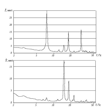 Исследовался резонансный режим работы машины при отсутствии литейной формы; это достаточно безопасные исследования, т.к. масса ротора примерно вдвое меньше и отсутствует формовочная смесь. Датчик, размещенный на нижней подвижной части роликовой опоры, позволил зафиксировать, а программное обеспечение анализатора позволило выполнить частотный анализ вибрации машины (рис. 2). Наибольшие виброскорости в области низких частот наблюдаются в пределах 8, 16 и 18 Гц; 8 Гц – соответствует частоте вращения ротора, 16 Гц – 2-я гармоника роторной частоты и 18 Гц соответствует передаточному отношению от ролика к ротору.