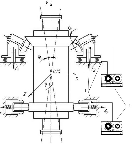 Целью исследований являлось получение объективной информации о динамике машины и сравнение фактических параметров вибрации с результатами исследований колебательных процессов [1–3], проведенных на математических моделях. Для этого выполнены измерения колебаний подвижных частей роликовых опор и фундамента машины на этапах подготовки формы к заливке металлом. Выполнялись условия: