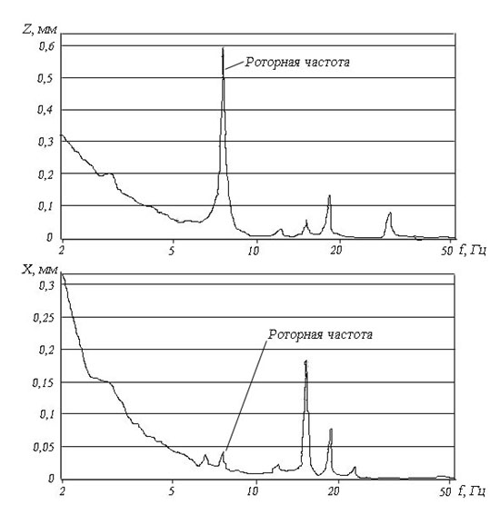 На переходных режимах допускаются значительно большие виброскорости. Спектрограммы перемещений опор (рис. 6) получены двойным интегрированием сигнала виброускорений, поэтому на частотах менее 5 Гц малодостоверны.