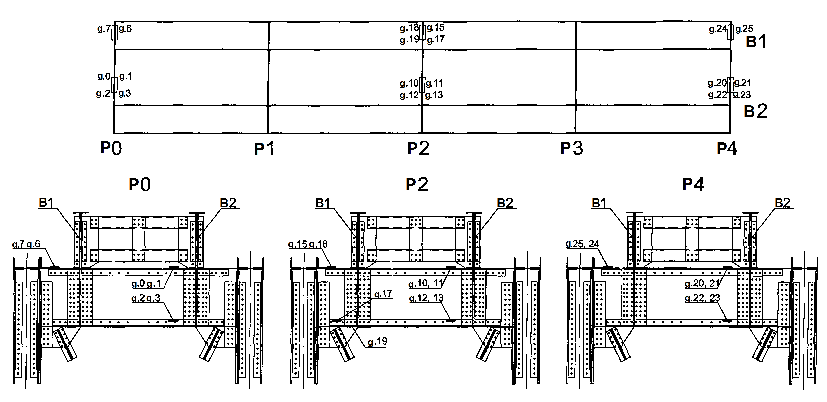 Static tests were carried out in «windows» with a duration of 2 hours. Two shunting diesel locomotives ChME-3 were used as a test load. Schemes of arrangement of strain gages during the span structure static tests are shown in Fig. 2–4.