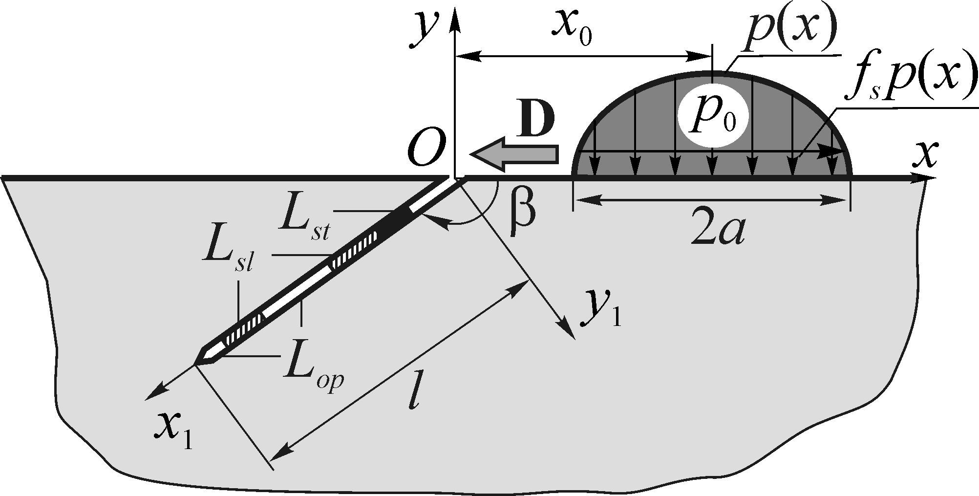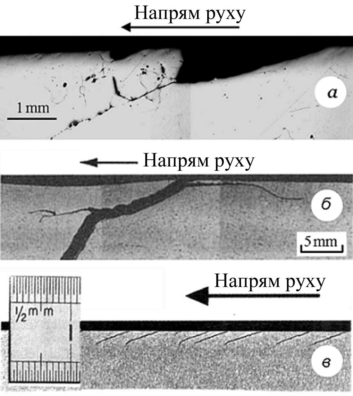 Під час експлуатації технічної пари «колесо-рейка» поверхні кочення залізничних рейок часто пошкоджуються тріщиноподібними дефектами (рис. 1). При цьому, як показує інженерна практика, на початковій стадії свого розвитку поверхневі макротріщини у головці рейки здебільш поширюються під кутом 10°–40° [5, 11, 13, 16] у напрямку переміщення рухомого складу. А при формуванні дефекту типу «нора» (див. рис. 1, б), крім лівої магістральної вітки, під малим кутом до поверхні кочення і з того ж самого місця додатково розвивається ще і його права вітка. Тому для оцінювання контактної міцності та довговічності пошкодженої рейки важливо визначити її напружено-деформований стан або ж коефіцієнти інтенсивності напружень (КІН) у вершинах тріщин – місцях виникнення найбільшої концентрації напружень і одночасно місцях подальшого руйнування матеріалу.