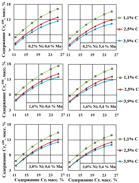 Никель, способствуя образованию аустенита, снижает растворимость углерода, особенно при высоких температурах [6]. Одновременно с этим, атомы никеля практически отсутствуют в карбидной фазе, в основном легируя твердые растворы хромсодержащих сплавов [3, 11].