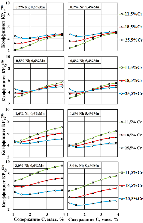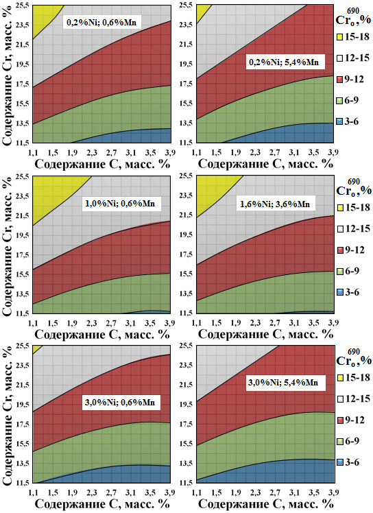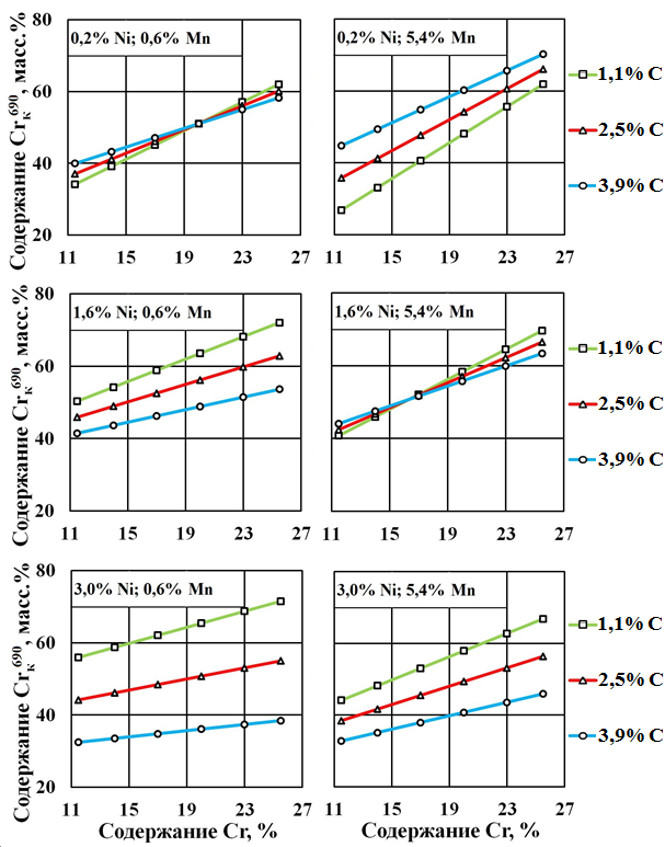 Purpose. The article is aimed to determine effect of the chemical composition of Fe-C-Cr-Mn-Ni cast iron on the chromium content in the metallic base, carbides and the coefficient of interphase distribution of chromium after annealing at 690 ° С (КРСr690). Methodology. Cast irons containing 1.09–3.91% C; 11.43–25.57% Cr; 0.6–5.4% Mn; 0.19–3.01% Ni and 0.8–1.2% Si were investigated. The analysis of chromium distribution was carried out using mathematical statistics methods. Cast iron was melted in induction furnace with a capacity of 60 kg. Findings. The use of methods of active planning of the experiment 24-1 allowed us to establish regression dependencies of the chromium concentration in the base and carbides, as well as its interphase distribution coefficient on the С, Mn, Cr and Ni content in the cast iron. Chromium, after annealing, was mainly concentrated in carbides. The chromium content of the base varies from 3.94% at 3.23% C, 5.4% Mn, 11.43% Cr and 3.01% Ni to 17.43% at 1.09% C, 0.60% Mn, 25.57% Cr and 1.32% Ni. The minimum value of the distribution coefficient of CRC690 was 2.1 in cast iron, of composition 1.09% C, 0.6% Mn, 11.43% Cr and 0.19% Ni, maximum 9.4 at 3.91% C, 0, 6% Mn, 11.43% Cr and 3.01% Ni. The distribution of chromium was determined by the amount and type of carbides formed. During annealing, the carbides’ composition was formed as a result of carbide-forming elements contention and replacement of iron and manganese atoms by chromium atoms. Originality. Authors obtained regression dependences of the chromium content in the base, carbides and its interfacial distribution coefficient on the chemical composition of Fe-C-Cr-Mn-Ni cast iron after annealing at 690 ° C. Practical value. The obtained dependencies allow predicting the chromium content in the metallic base and may be used during the elaboration of the new wear resistant cast irons compositions, as well as in the choice of heat treatment regimes.