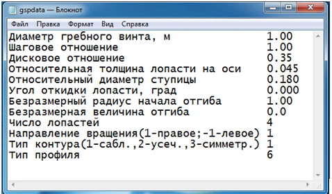 Fig.1. The initial data for the program-generator of the surface of propellers GSP3D, described in [4]