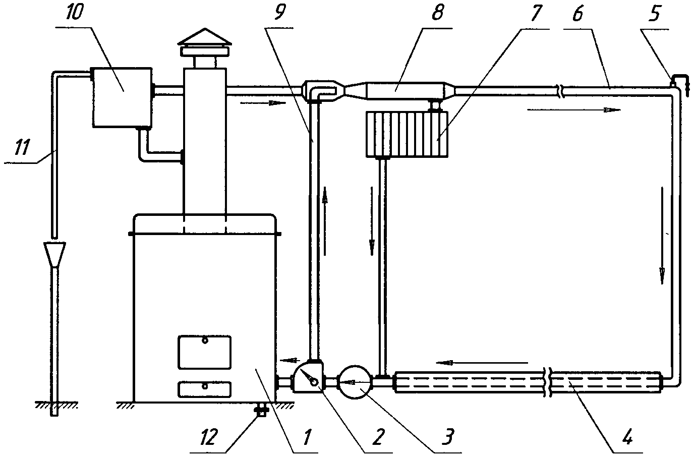 The principle of operation of the system, whose layout is shown in Fig. 2, consists in the separation of the heat transfer fluid flow at the inlet to the boiler into two adjustable parts by the divider 2 with an electric drive. One part of the flow returns to the boiler 1, and the second one through the bypass pipe 9, passing the boiler, goes to the mixer 8. The movement of the heat transfer fluid through the system is carried out by a circulation pump 3. Depending on the required heating output of the system, a heat transfer fluid with the required temperature is fed into the heating devices through the mixer 8. In this case, there is no need for strict maintenance of any value of the heat transfer fluid temperature at the outlet from the boiler.