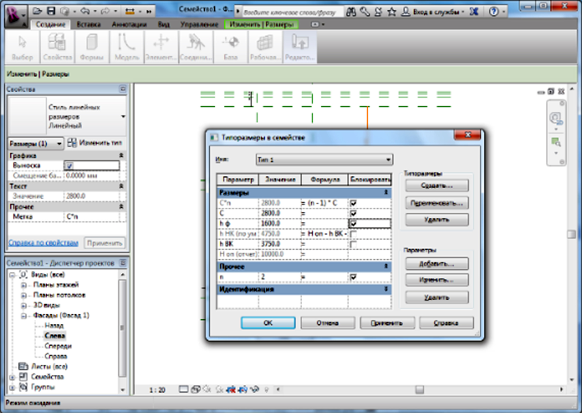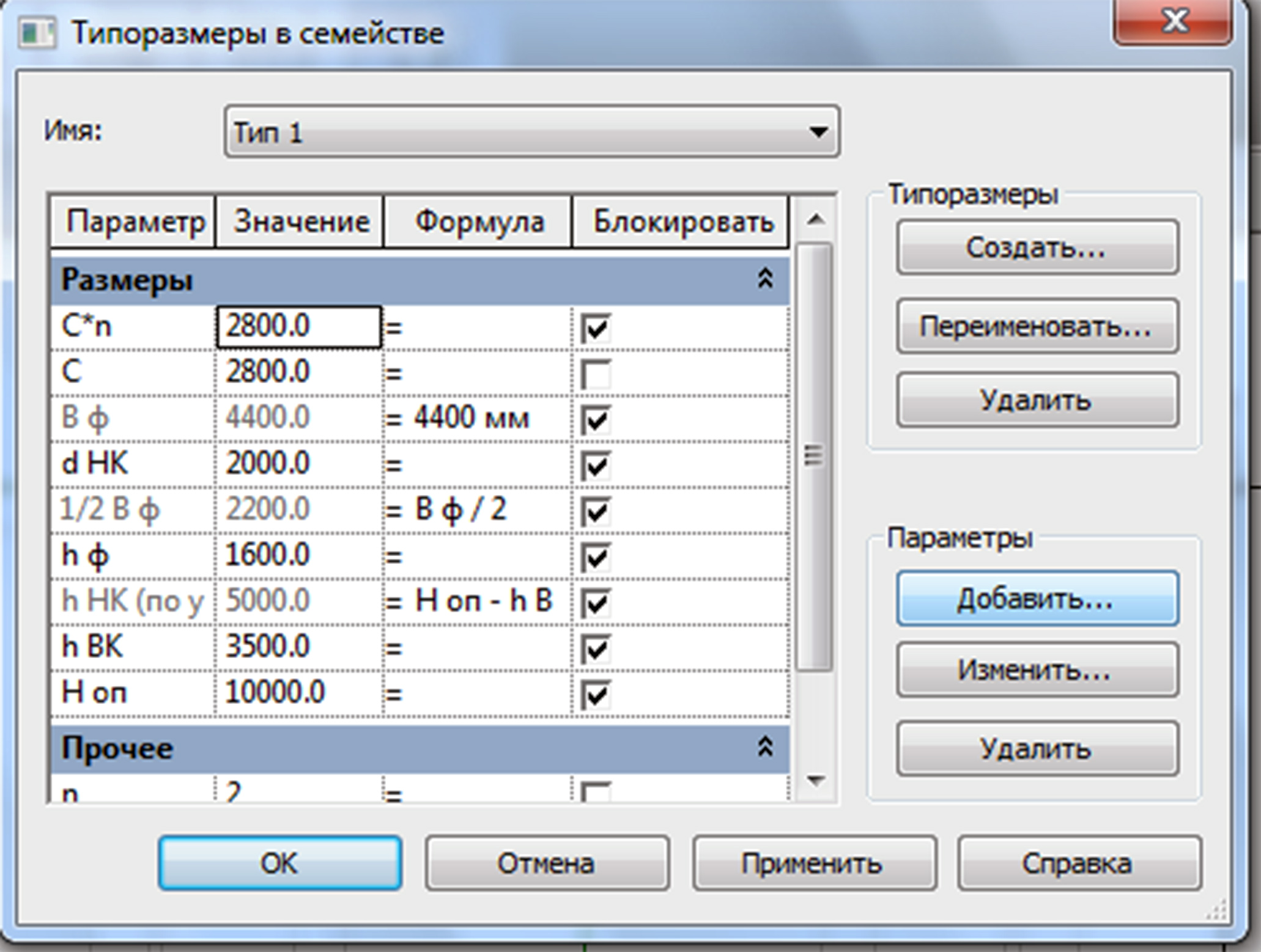 Створюючи опорні площини, одразу зафіксуємо незмінні розміри – висоту підферменної та проміжної плит та висоту фасок (поставимо «замочок»). Для змінних розмірів введемо відповідні параметри через «СЕМЕЙСТВО» – «ТИПОРАЗМЕРЫ В СЕМЕЙСТВЕ» (рис. 4). Такими будуть висота фундаменту hф, висота нижньої частини опори hНК, що залежить від hоп, та висота колон hВК.