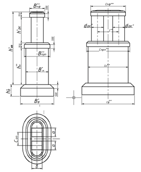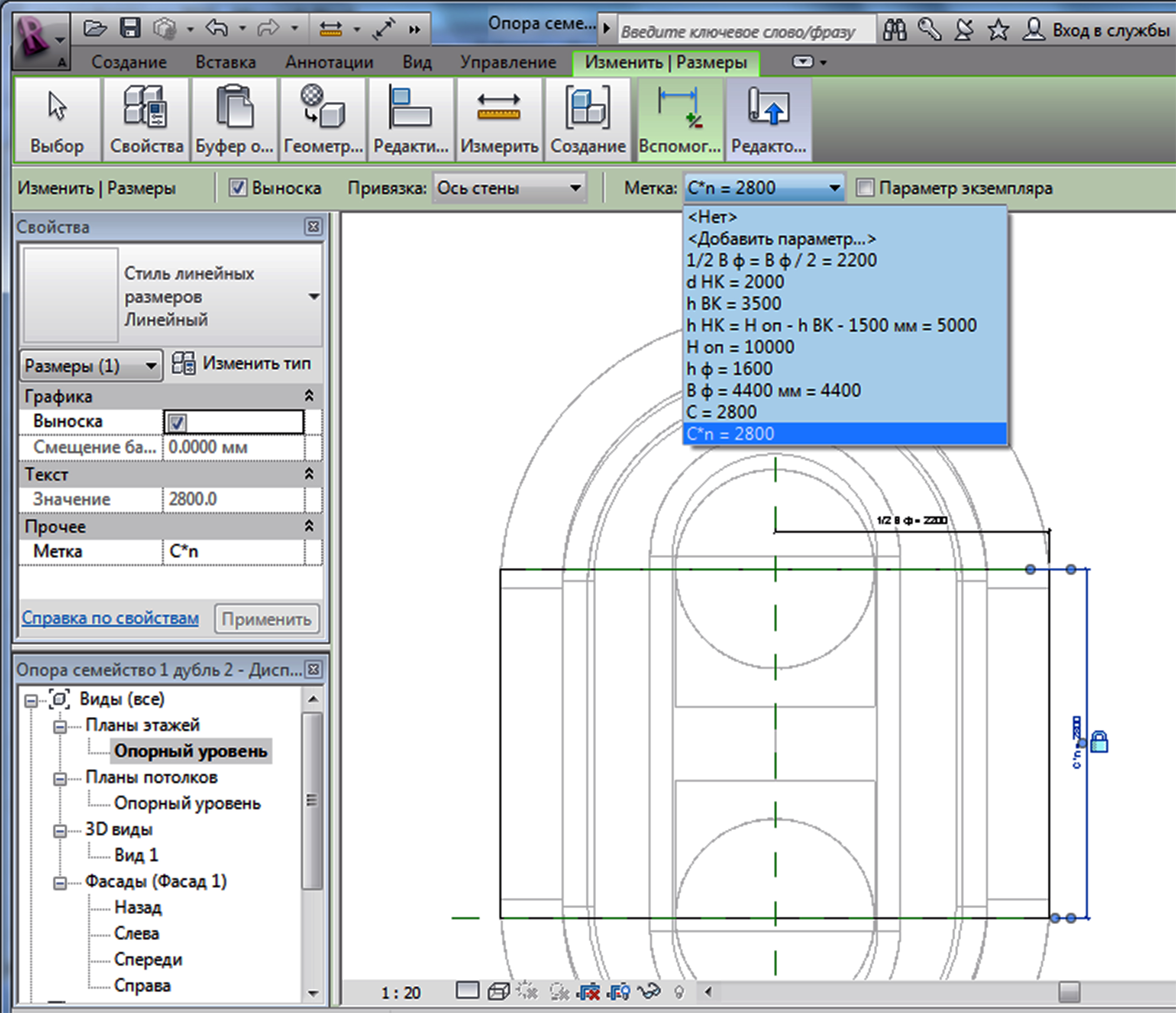 Одразу перевіримо коректність роботи створеного об’єкта при зміні параметрів. Для цього збільшимо відстань між осями С вдвічі та змінимо висоту фундаменту hф з 1 600 мм на 2 000 мм (рис. 5, є). Для порівняння змін залишимо в проекті модель опори, що імпортована з AutoCAD. Очевидно, що побудоване тіло змінило розміри, отже параметри задані коректно.