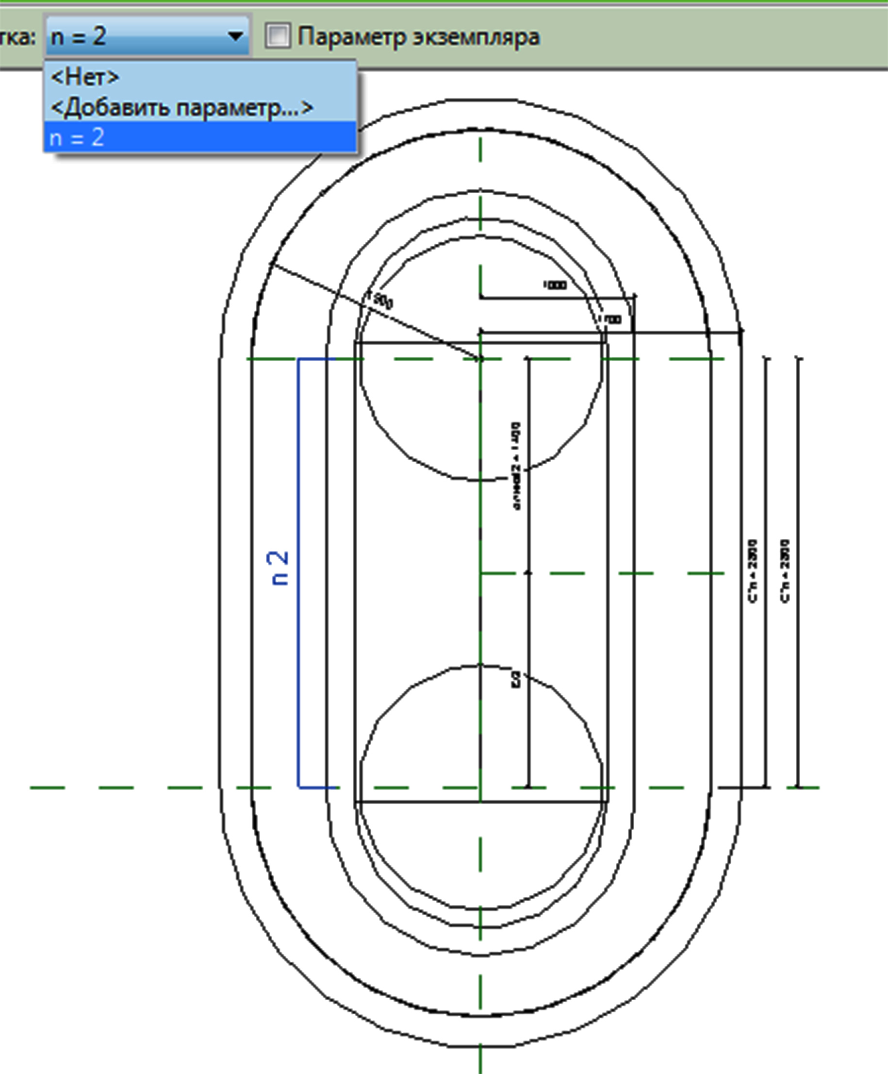 Враховуючи, що планується на базі вибраної опори залізничного моста створити опору для автодорожнього моста, де кількість колон більша двох, побудуємо другу колону за допомогою команди «МАССИВ». Відстань між елементами масиву дорівнює відстані між осями колон С. Кількість елементів – 2, але добавимо змінний параметр n в таблицю «ТИПОРАЗМЕРЫ В СИМЕЙСТВЕ» (рис. 8, в). Якщо змінити кількість елементів n з 2 на 5, побачимо, що опора коректно змінює параметри (рис. 8, г).