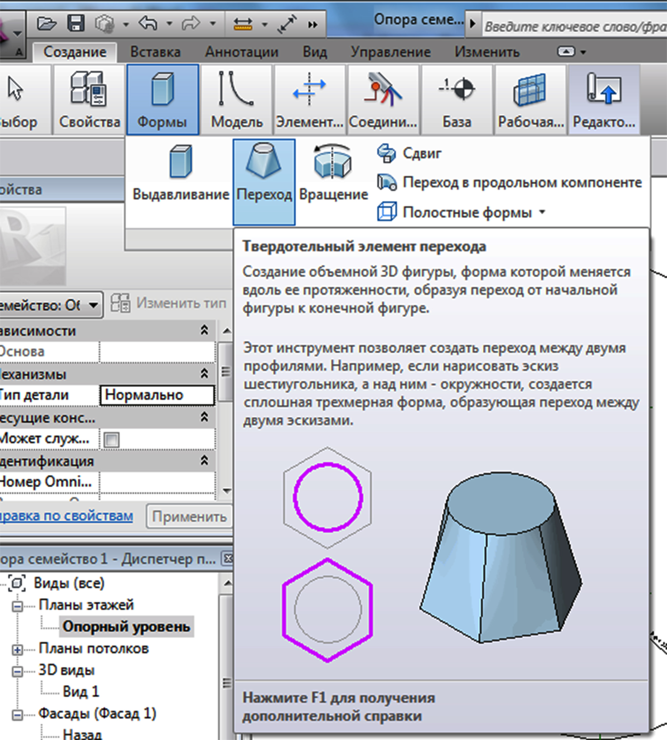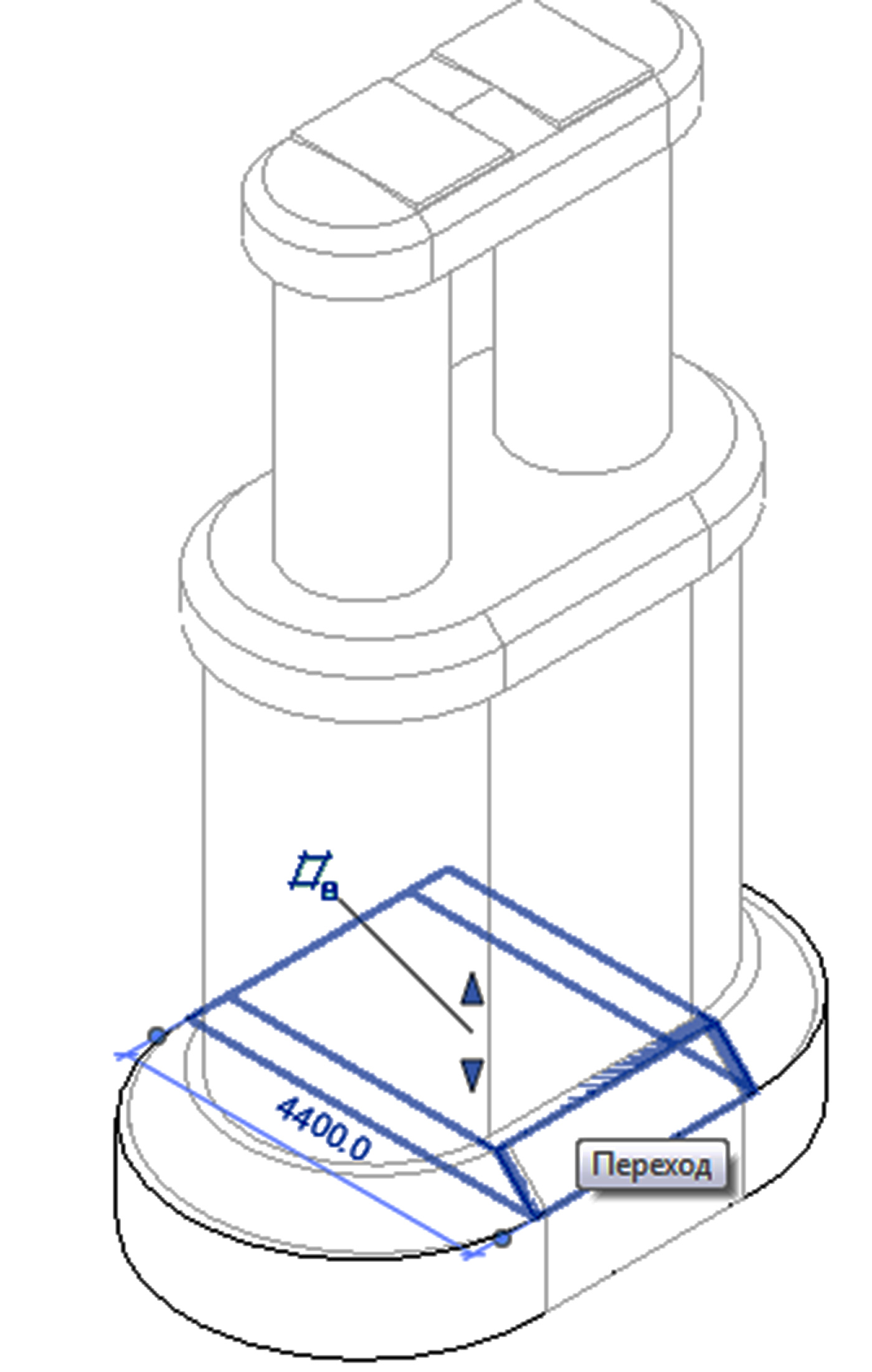 Фаску фундаменту побудуємо за допомогою інструмента «СОЗДАТЬ» – «ПЕРЕХОД» (рис. 6, а). Спочатку слід вказати «робочу площину», вибравши її з раніше створених. Далі будуємо контур нижньої основи тіла переходу, потім контур верхньої онови. Задаємо висоту видавлювання – 500 мм, і підтверджуємо, що побудови закінчено. Усі контури прив’язуємо до відповідних ліній ескізу (імпортованої моделі). Форму переходу поділимо на три умовні частини, як і попередню форму видавлювання. Центральну частину прямокутної форми бачимо на рис. 6, б.