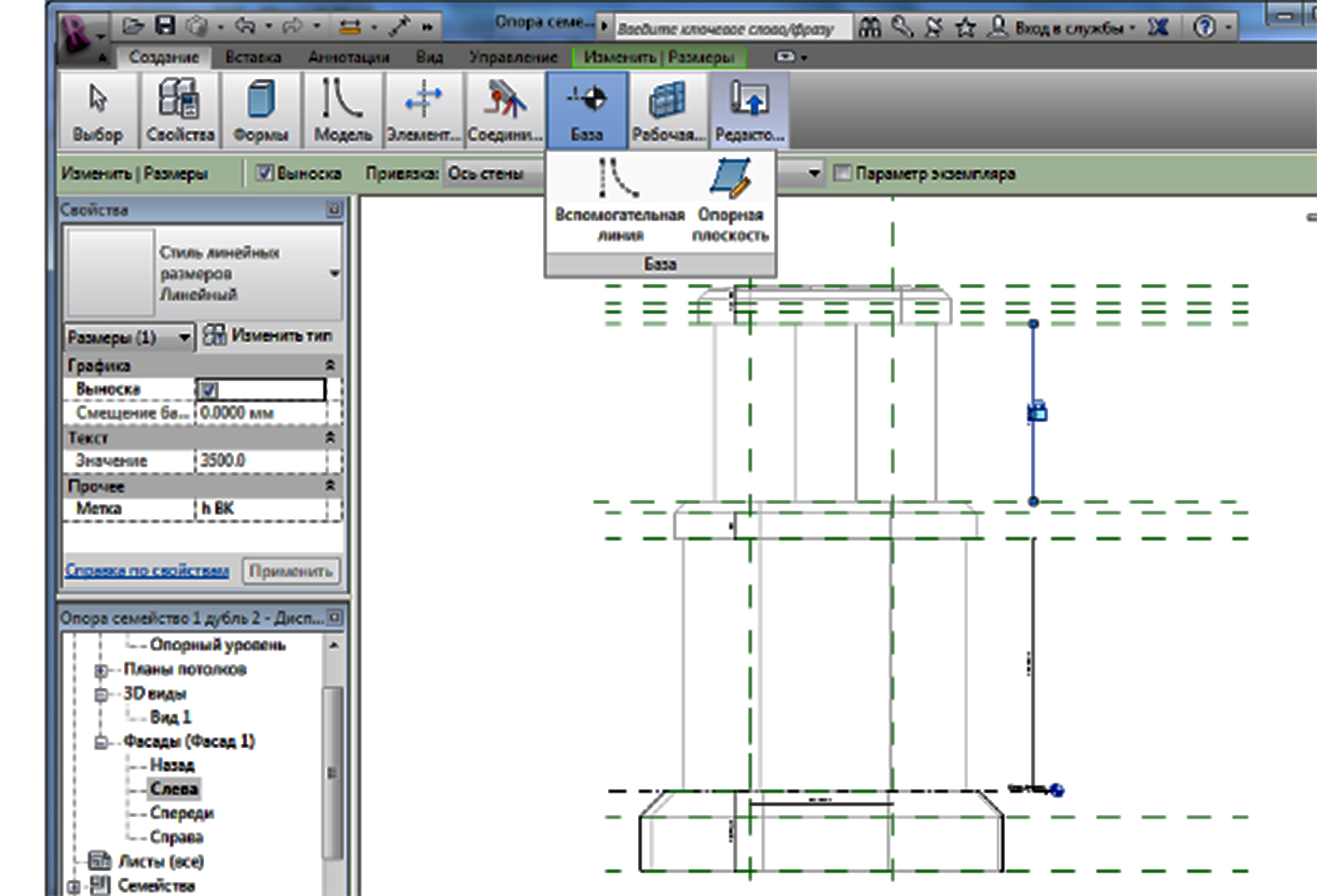 Інструменти і принципи просторового моделювання Revit відрізняються від звичних нам інструментів моделювання Autocad [1, 5]. Замість команд «ЯЩИК» та «ФАСКА» в Revit користуються «ВЫДАВИТЬ» та «ПЕРЕХОД». Але спочатку в Revit потрібно створити так звані «опорні площини». Для спрощення побудов імпортуємо існуючий файл Autocad через меню «ВСТАВКА» – «ИМПОРТ ИЗ ФОРМАТОВ САПР». Побудуємо спочатку площини рівня, прив’язуючи їх до існуючих площин імпортованої моделі по фасаду (рис. 3), [6, 7].