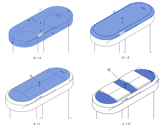 Геометрія проміжної плити аналогічна геометрії фундаменту, тож послідовно виконаємо операції, аналогічні раніше розглянутим (рис. 7, в, 7, г). Наприкінці побудов зафіксуємо обєкт, скріплюючи його з опорними площинами.