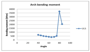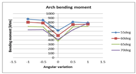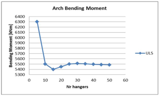 In Figure 14 we can see that arch compression tends to decrease with the increasing angle to the horizontal plane. This is explained by the fact that more inclined hangers are less tensioned, due to the small horizontal component of the force. The range most effective for this opening is between 60 to 80 degrees. Bending moments in arches shown in Figure 12. Indicate that the suspensions above 75 degrees inclinations involve large bending moments in arches.