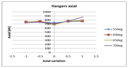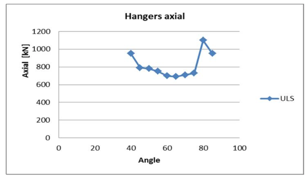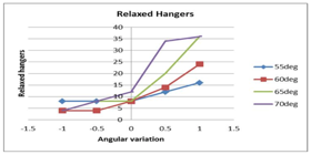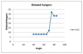 As shown in Figure 11, relaxed hangers number is relatively high in this arrangement. As with the horizontal angle is greater, the higher the number of the relaxed hangers. In each case analyzed the hangers at the ends were always relaxed.