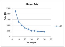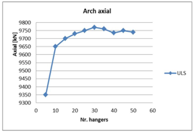 In this configuration the compression forces in the arch increases with the number of hangers as shown in Figure 6. It was observed that with increasing number of hangers, compression increases in the arches, while the hanger’s axial efforts decrease as in Figure 5.