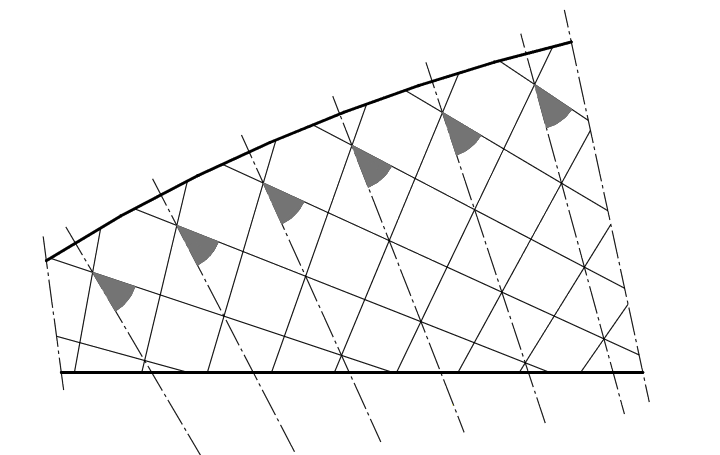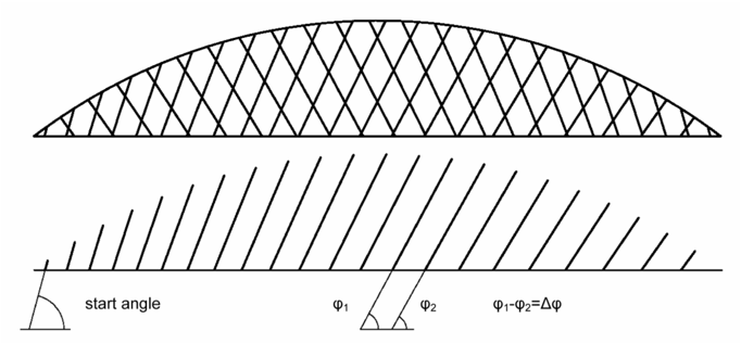 P. Tveit theory, this method follows the same concept as the previous one [9, 10]. In this case, however, the slope of each hanger varies following, for instance, a linear function like Δφ= α.х+β, where х is the number of the hanger, α and β are the parameters that make the hanger arrangement vary along the length of the arch [4, 5, 10]. A general case is illustrated in Figure 9 Assigning a constant slope is a particular case of this configuration, when α is taken as 0.