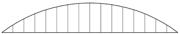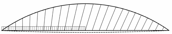 To simplify the manufacturing process and for a uniform distribution of the moment, and to reduce the buckling length in many cases the hangers are disposed at equal distances along the arc [8]. In this case, the unknowns are the locations of nodes on the tie beam. An alternative is to arrange the hangers at equal distances along the tie beam and the arc node locations are the unknowns.