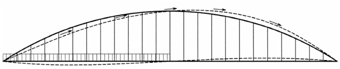A network arch bridge is a tied arch bridge with inclined hangers intersecting at least twice [3, 5, 10]. Compared with regular tied arch bridges, i.e. those with vertical hangers, the network arch bridge exhibits low moments in both of the chords, which typically leads to important material savings. In Figure 3 it can be seen that the network arch tends to behave like a simple beam, due to its higher stiffness, leading to small deflections. As Figures show, partial loading on half of the span will lead to deflections on the upper and lower chord in the arch with vertical hangers while the arch with inclined hangers only observes deflections on the lower chord.
