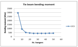 The tie beam axial efforts variations do not appear in the system with vertical hangers, but the hanger number variation significantly influences the bending moment in the beam because the hangers play the role of elastic supports for tie beam as in Figure 8.