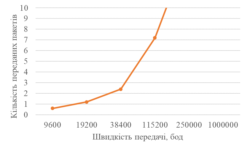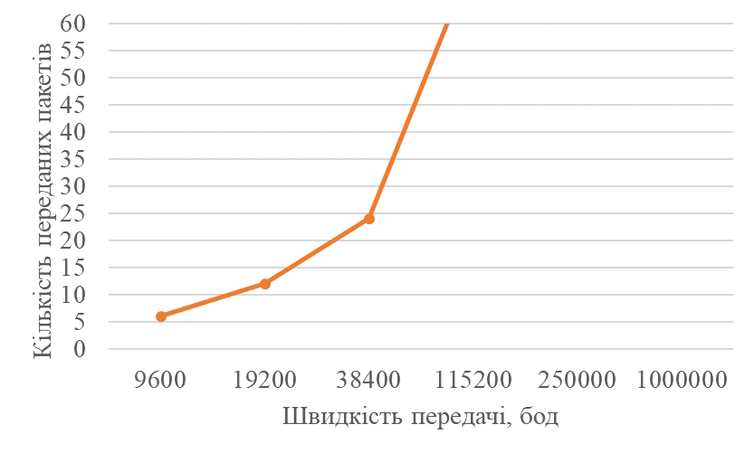 Як видно з рис. 2, при алгоритмі обробки даних від датчика за 1/10 обертання поточної швидкості 9 600 бод явно недостатньо для передачі кадру даних від усіх трьох датчиків за умов максимальної частоти обертання. Схожа тенденція також демонструється на рис. 3 (на якому показано кількість переданих пакетів даних за один оберт валу при максимальній швидкості). Але в даному випадку можливо передати до 5 кадрів, що є цілком достатнім для роботи системи.