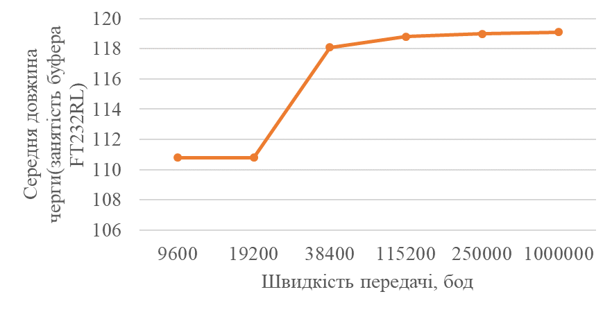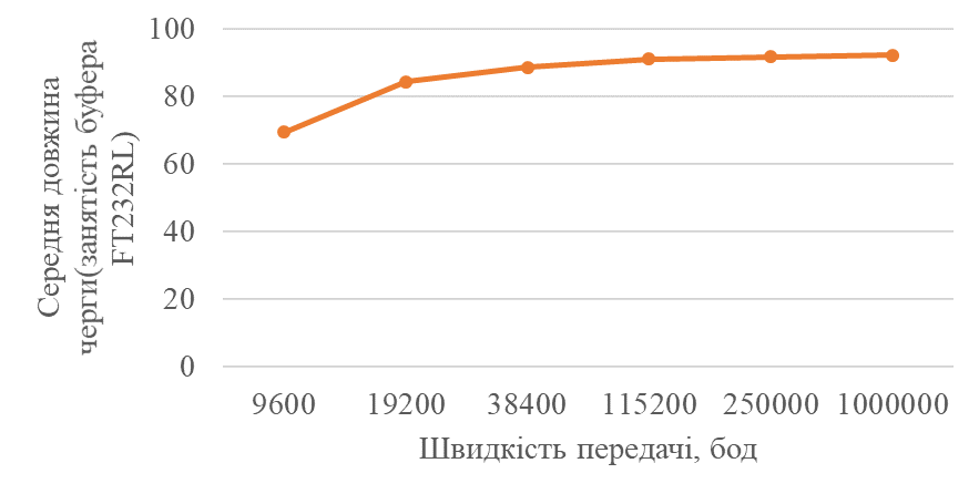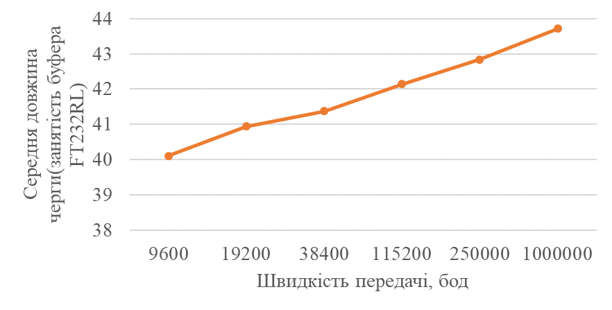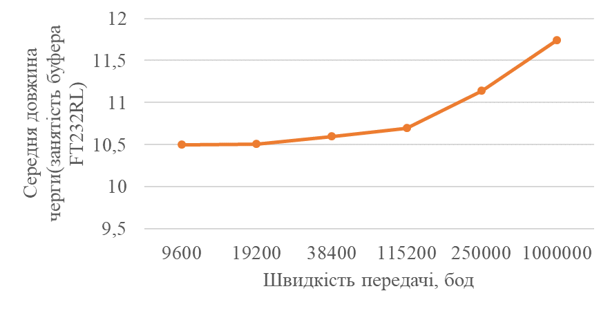Рис. 6. Залежність середньої довжини черги від швидкості передачі за 1/10 обертання всіх валів при частоті обертання 1 500хв-1, при часі опитування FT232RL 0,1 с.