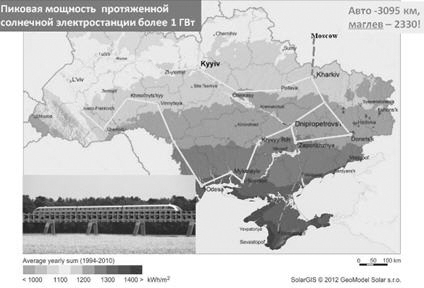 Рис. 1. МАГЛЕВ-магистраль на фоне атласа инсоляции Украины