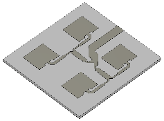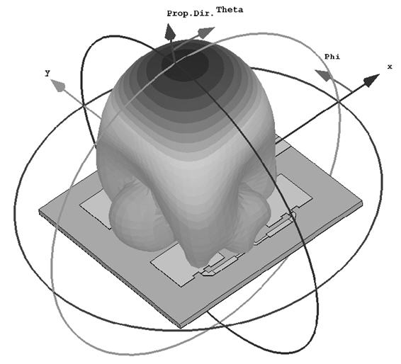 Рис. 3. Моделирование электродинамической системы для излучения и фокусировки микроволнового луча: а – базовый элемент микрополосной антенной решетки; б – трехмерная диаграмма антенной решетки