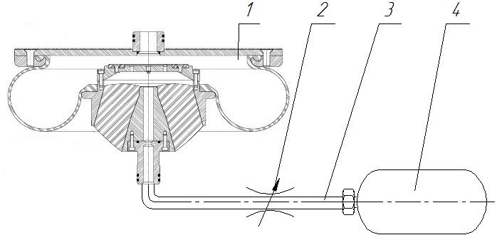 In general, the pneumatic suspension system (Fig. 2) on the car has the form of the pneumatic cylinder 1 and the auxiliary reservoir 4 connected to each other [17, 19, 22]. To regulate the dissipative and elastic properties of the pneumatic suspension system, the throttling element 2 is located in the connection fitting 3.