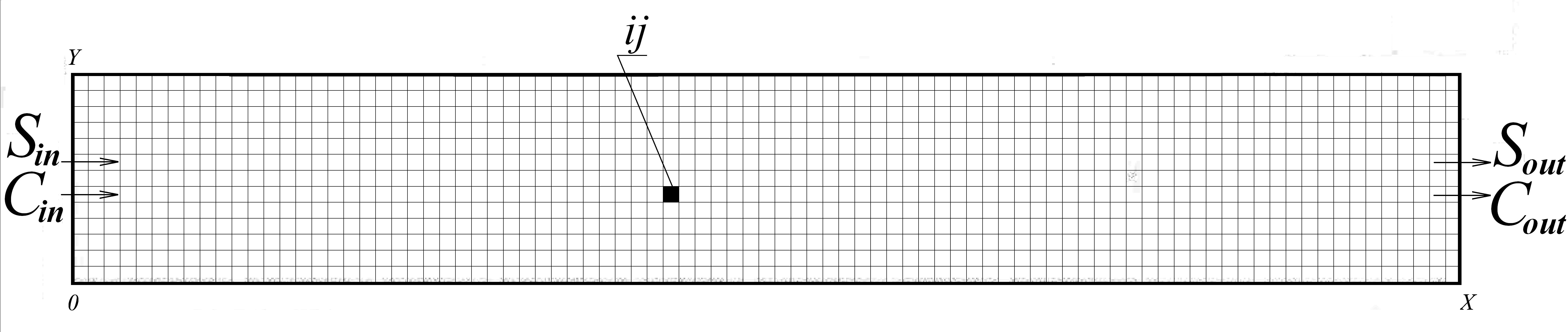 To perform numerical integration of governing equations rectangular grid was used. Concentration of substrate, sludge and P were determined in the centers of computational cells. Velocity components u, v were determined at the sides of computational cells.