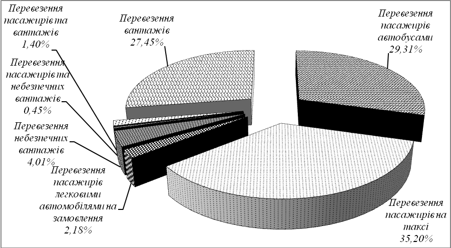 Сьогодні на ринку комерційних перевезень України здійснюють підприємницьку діяльність майже 56,2 тис. перевізників, які використовують більше 154 тис. транспортних засобів. На рис. 1 подано розподіл транспортних ліцензій за видами перевезень.