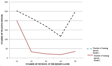 Experimental studies of the dependence of the training time (number of epochs) on the number of hidden neurons (from 10 to 55) on NN were conducted: Model No. 1 (Resilient algorithm), Model No. 2 (Batch algorithm); the Batch algorithm NM is trained three times faster than the NN based on the Resilient algorithm. The experimental studies of the dependence of the training time on the number of hidden layers (from 1 to 4) on the NN were conducted: Model No. 3 (Incremental algorithm), Model No. 4 (Resilient algorithm); the Resilient algorithm NM is trained almost twice as fast as NN by the Incremental algorithm.