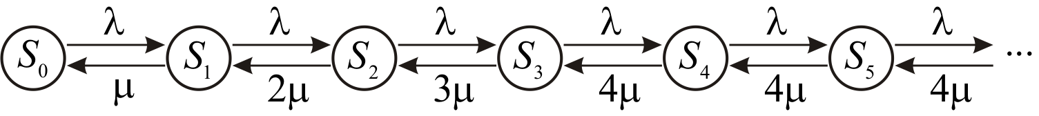 To analyze the random processes with discrete states it is convenient to use the so-called graph of states and transitions. For further calculation of the efficiency characteristics of the QS operation, it is necessary to determine the possible states of the system, as well as the probability of occurrence of these states (pi), which are called the limit probabilities of the system.