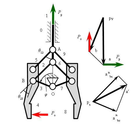 Під час проектування схеми захоплювального механізму важливо забезпечити, щоб швидкість затискних елементів у момент контакту з об’єктом маніпулювання була сталою й мінімально можливою для уникнення динамічних перенавантажень. З цієї ж причини кутові швидкості й кутові пришвидшення вихідних ланок механізму також повинні бути мінімальні. Для захоплювачів, побудованих на основі стрижньових схем, доцільне оптимальне проектування з використанням критеріїв передавання руху або індексів передачі[5, 12–15,19,20]. Існує декілька критеріїв якості передачі руху, і останнім часом таких показників пропонується більше: на основі геометричної кінематики, відносних величин сил і реакцій у кінематичних парах, кутів тиску й передавання, погрішностей, чутливості до зміни розмірів ланок механізму, коефіцієнта корисної дії, існування збірок механізму, швидкостей, пришвидшень та ривка окремих і вихідних ланок механізму. Між більшістю критеріїв існує безумовний зв’язок. Великі кути передачі(малі кути тиску) практично гарантують невисокі швидкості й пришвидшення і відсутність ривків, нечутливість механізму до відхилення розмірів ланок від номінальних, інших погрішностей. Щодо енергетичних та силових критеріїв якості руху, то між ними також існує певний зв’язок.