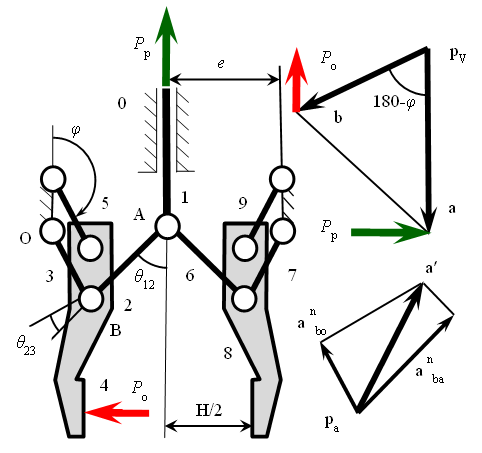 Десятиланковий стрижньовий механізм захоплювача побудований на основі спареного паралелограмного центрального кривошипно-повзункового механізму з ведучим повзуном. Ведучий повзун 1 (рис.1) впливає на шатуни 2 і 6, що з’єднані коромислами 3 і 7 зі станиною 0. На кінці шатунів шарнірно закріплені ланки 4 й 8, що містять затискні елементи захоплювача. Додані діади 4–5 і 8–9 утворюють паралелограм і забезпечують плоскопаралельний рух затискних елементів.