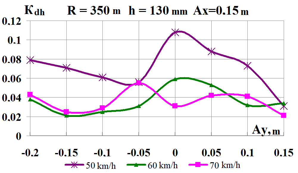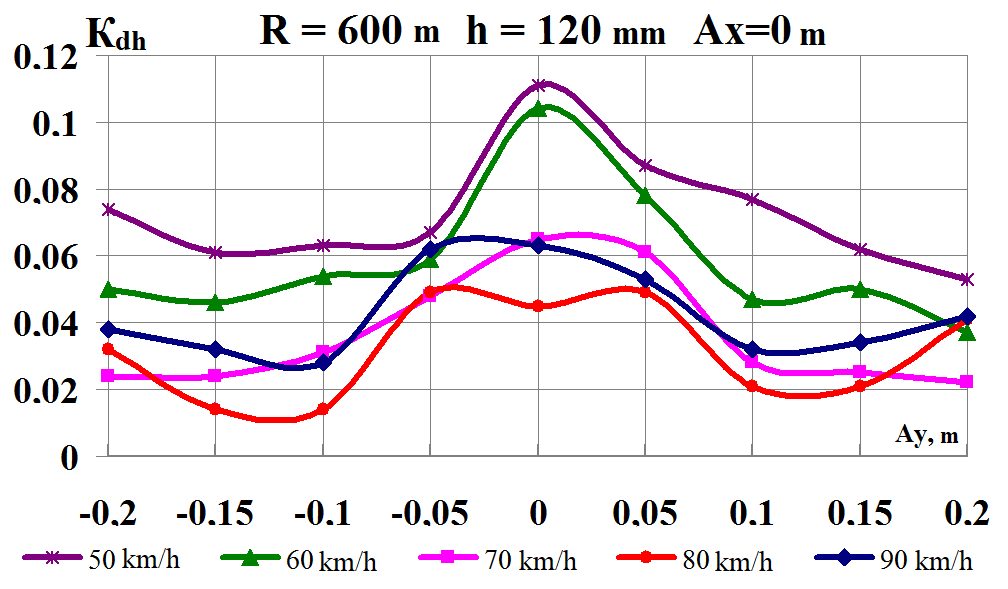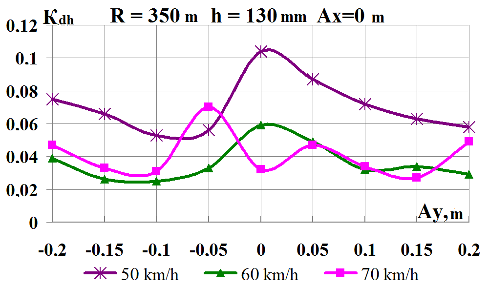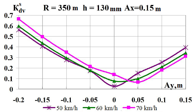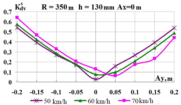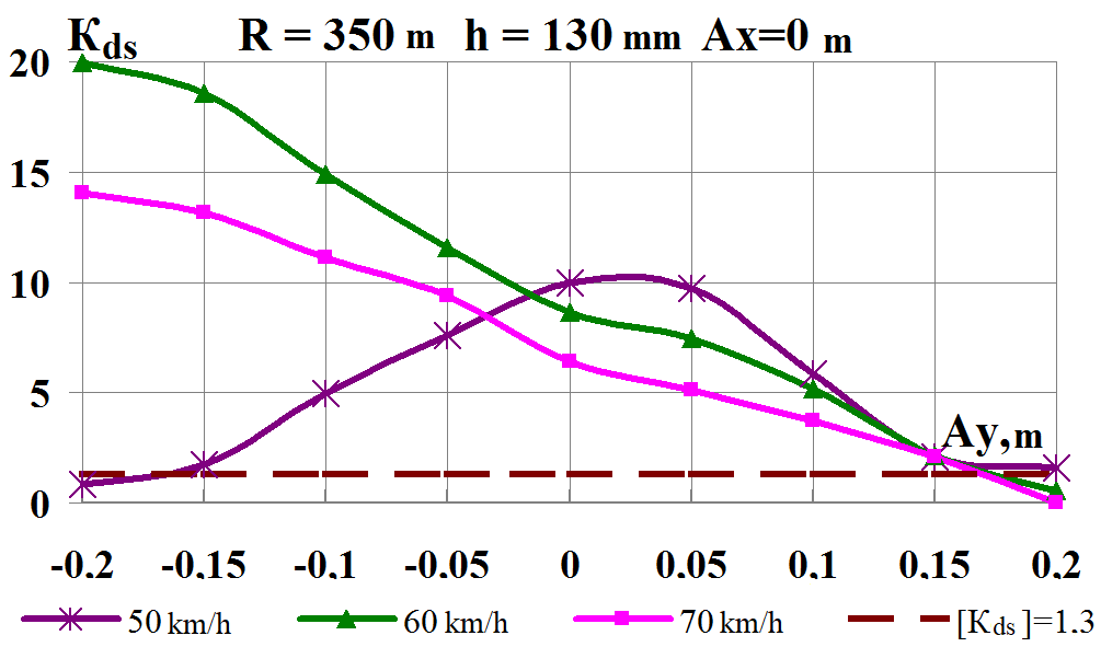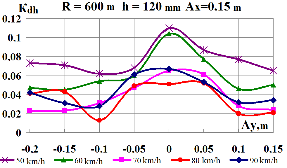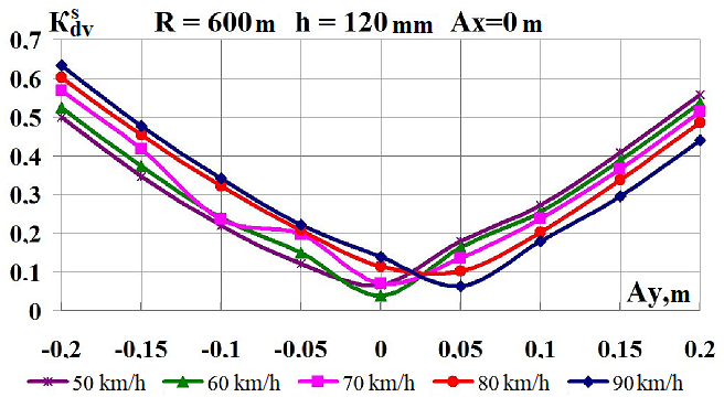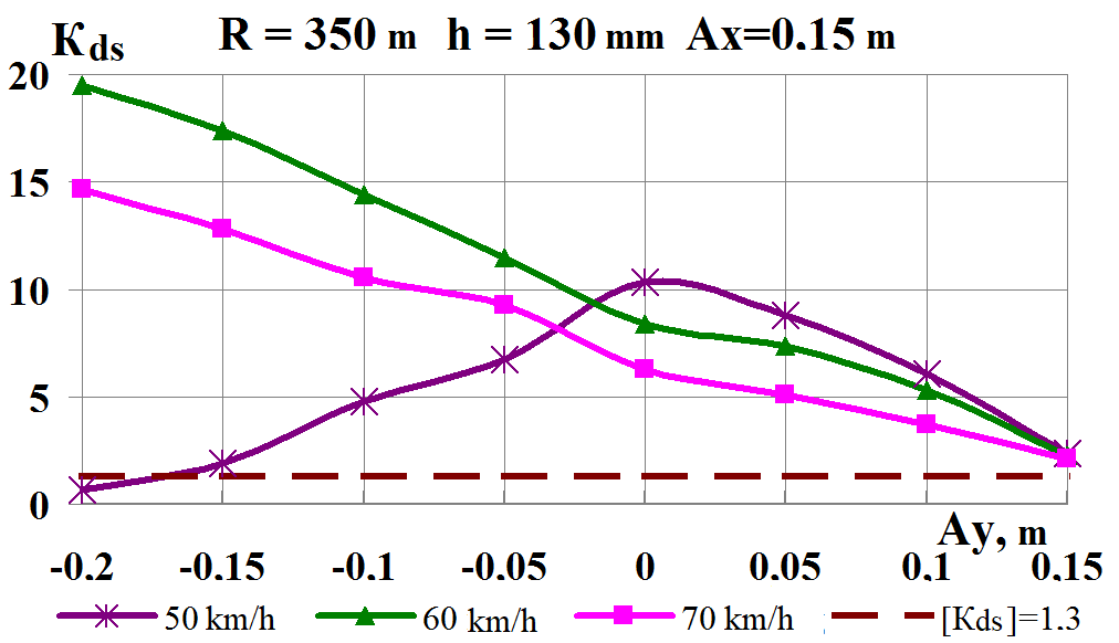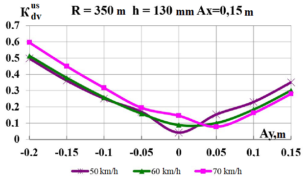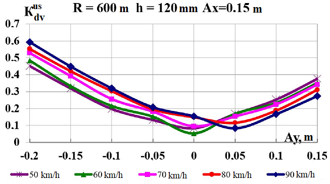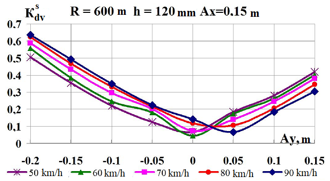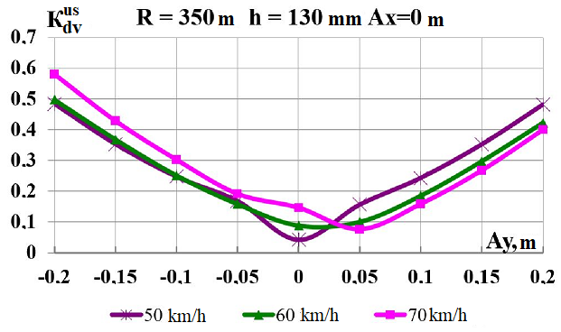Цель. Определение влияния продольного и поперечного смещения центра тяжести тяжеловесного груза на платформах, с учетом скорости движения на основные динамические показатели – максимальные коэффициенты динамической добавки обрессоренных и необрессоренных частей, максимальное отношения рамной силы к статической осевой нагрузке, коэффициент устойчивости колеса от схода с рельсов. Методика. Основой исследования является метод математического и компьютерного моделирования динамической нагруженности платформы с использованием модели пространственных колебаний сцепа из пяти вагонов и программного комплекса, разработанного в отраслевой научно-исследовательской лаборатории динамики и прочности подвижного состава (ОНИЛ ДППС). Теоретические исследования проведены при движении платформы модели 13–401 с типичными тележками 18–100 со скоростями в интервале от 50 до 90 км/ч по кривым с радиусами 350 и 600 м, с возвышением наружного рельса 130 и 120 мм соответственно. Результаты. Представлен анализ теоретических исследований динамических качеств подвижного состава на примере платформ. Расчеты проведены с использованием пакета прикладных программ. В ходе выполнения теоретических исследований и после моделирования с учетом процессов колебания вагона-платформы и груза, при наличии продольного и поперечного смещения его центра тяжести, получены зависимости основных динамических показателей на основании величины скорости движения. Научная новизна. Для определения динамической нагруженности вагона-платформы, с применением математической модели сцепа из пяти грузовых вагонов, исследовано влияние смещения в двух направлениях от центральной оси симметрии центра тяжести тяжеловесного груза с учетом величины скорости движения по криволинейным участкам пути малого и среднего радиуса. Практическая значимость. В результате проведенных теоретических исследований обоснованы рекомендации относительно максимально возможных величин смещения центра тяжести тяжеловесных грузов при их транспортировке на вагонах-платформах.