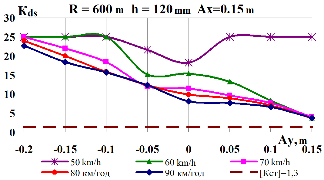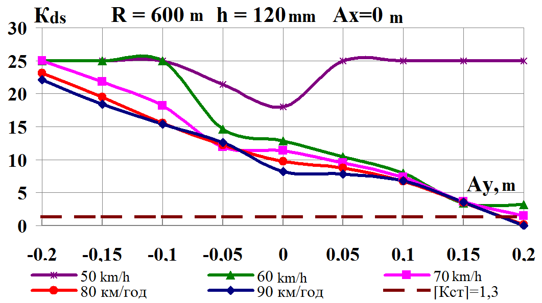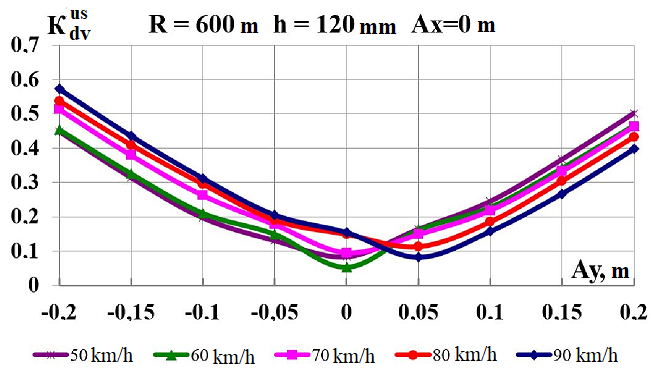 Мета. Визначення впливу поздовжнього й поперечного зміщення центра тяжіння великовагового вантажу на платформах, з урахуванням швидкості руху, на основні динамічні показники – максимальні коефіцієнти динамічної добавки обресорених і необресорених частин, максимальне відношення рамної сили до статичного осьового навантаження, коефіцієнт стійкості колеса від сходження з рейок. Методика. За основу дослідження взято метод математичного та комп’ютерного моделювання динамічної навантаженості платформи з використанням моделі просторових коливань зчепу з п’яти вагонів і програмного комплексу, розробленого в галузевій науково-дослідній лабораторії динаміки й міцності рухомого складу (ГНДЛ ДМРС). Теоретичні дослідження проведені за умови руху платформи моделі 13–401 з типовими візками 18–100 зі швидкостями в інтервалі від 50 до 90 км/год по кривих із радіусами 350 й 600 м, із підвищеннями зовнішньої рейки 130 і 120 мм відповідно. Результати. Подано аналіз теоретичних досліджень динамічних якостей рухомого складу на прикладі платформ. Розрахунки проведені з використанням пакета прикладних програм. У ході виконання теоретичних досліджень і після проведення моделювання з урахуванням процесів коливання вагона-платформи й вантажу, за наявності поздовжнього й поперечного зміщення його центра тяжіння, отримано залежності основних динамічних показників з огляду на величину швидкості руху. Наукова новизна. Для визначення динамічної навантаженості вагона платформи, із застосуванням математичної моделі зчепу з п’яти вантажних вагонів, досліджено вплив зміщення у двох напрямках від центральної осі симетрії центра тяжіння великовагового вантажу з огляду на величину швидкості руху по кривих ділянках колії малого й середнього радіуса. Практична значимість. У результаті проведених теоретичних досліджень обґрунтовано рекомендації стосовно максимально можливих величин зміщення центра тяжіння великовагових вантажів під час їх транспортування на вагонах-платформах.