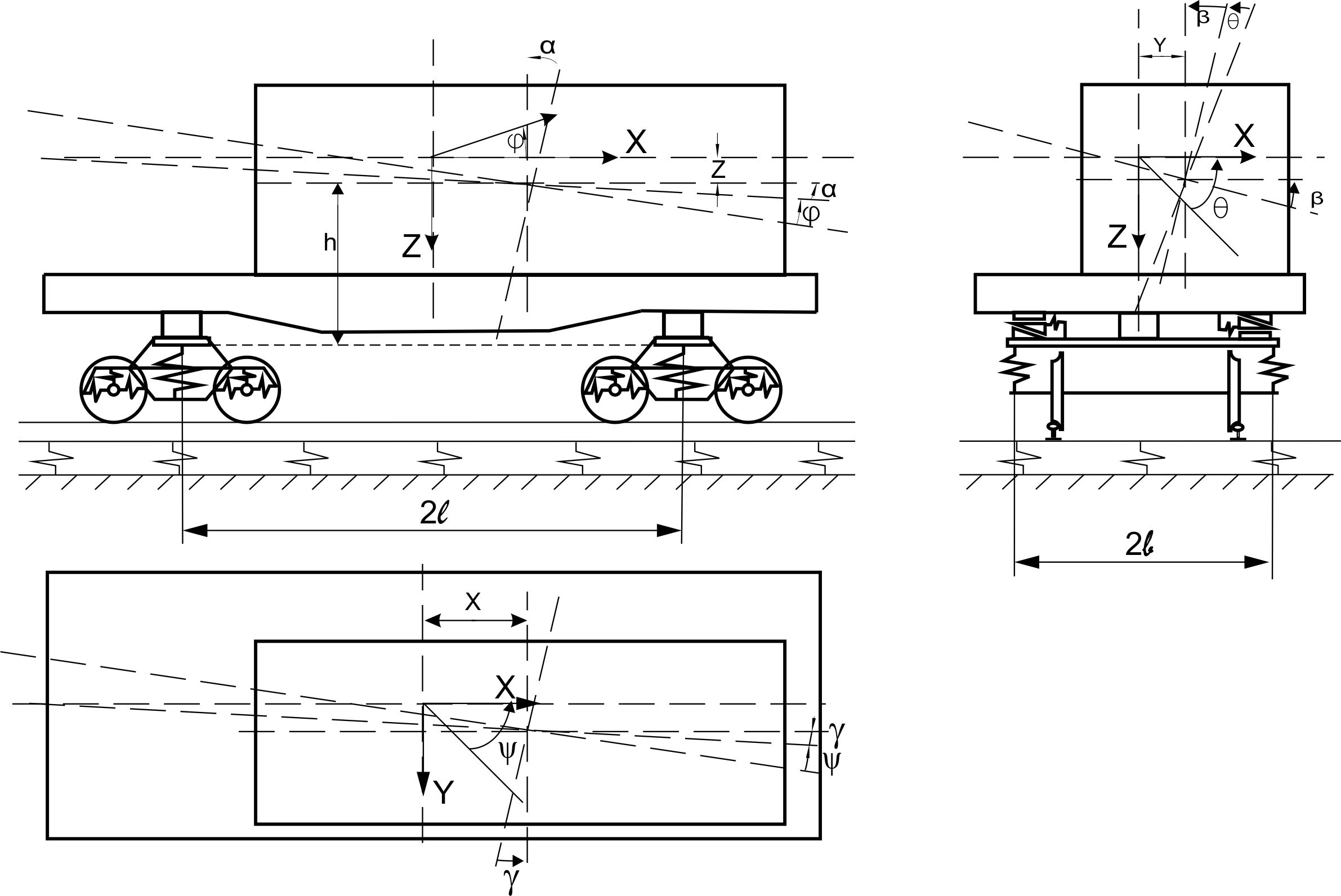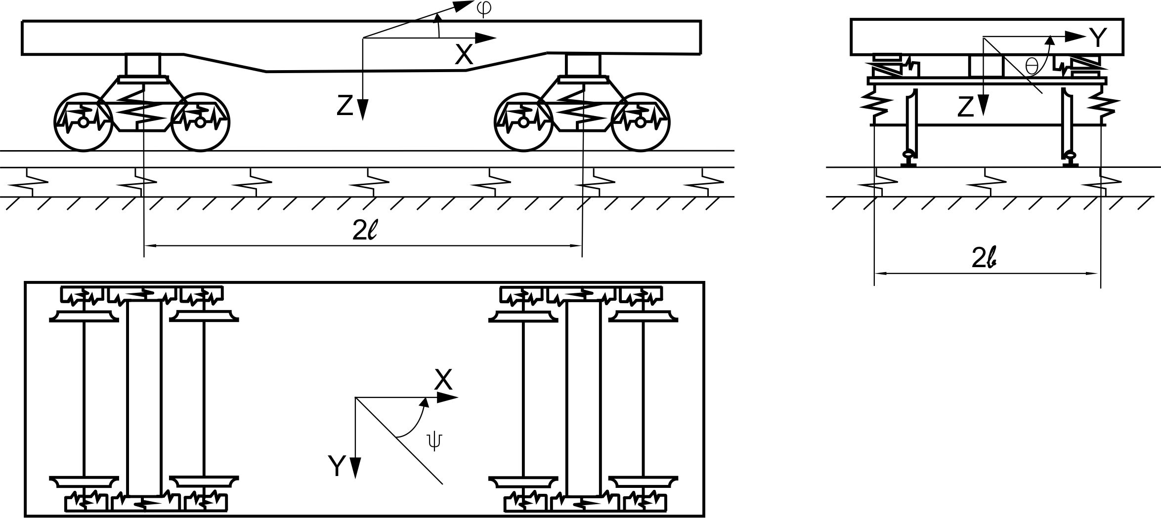The mathematical model describing the spatial oscillations of the coupled wagons in the train (Fig. 2) is proposed in [4], of which one rail vehicle is considered as per the most complete calculation scheme (called «zero»), and the calculation schemes of neighbouring wagons, depending from task setting, are simplified with increasing distance from the «zero» vehicle on both sides.