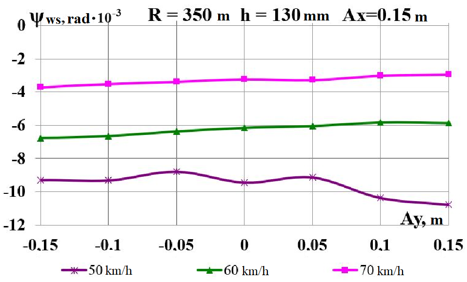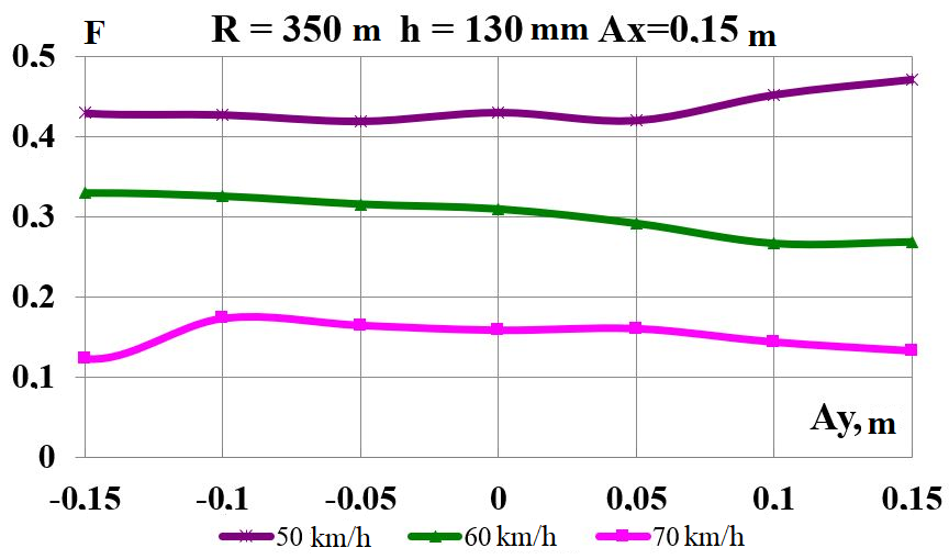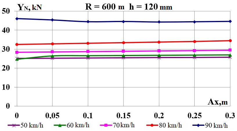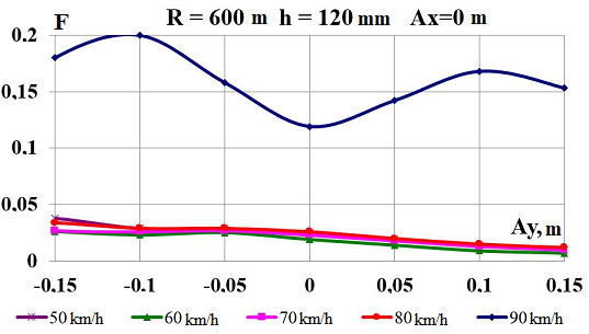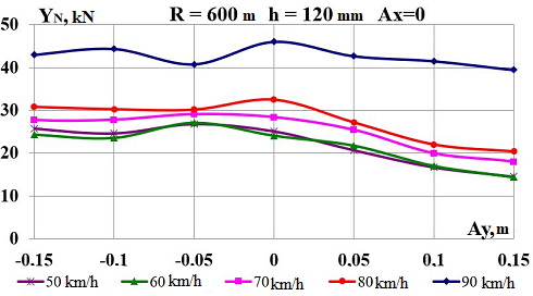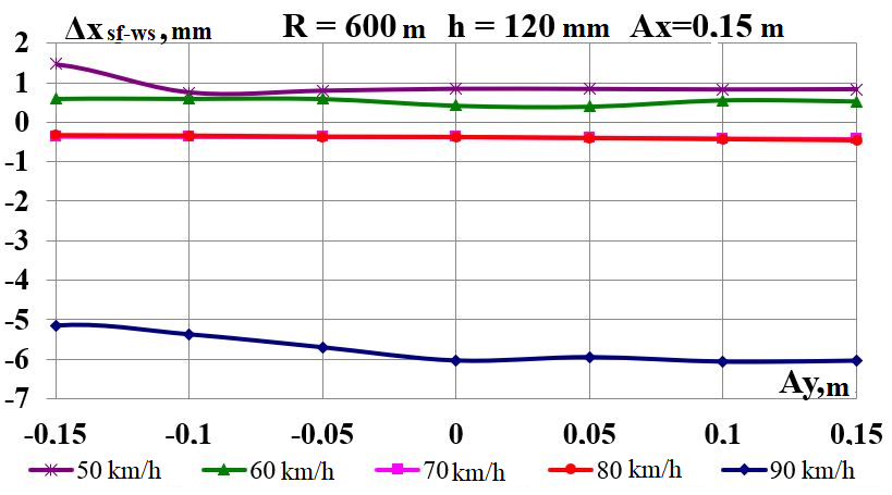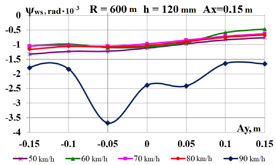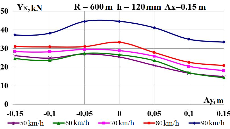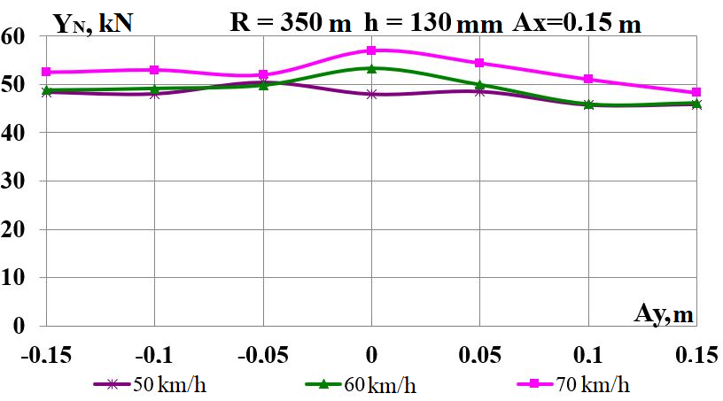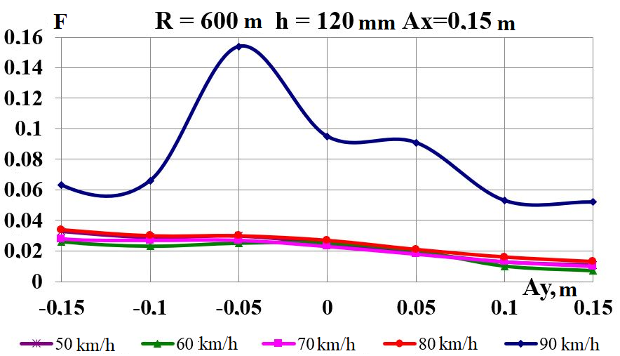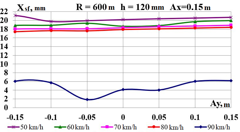 Цель. В научной работе нужно провести определение влияния несимметричной загрузки вагона-платформы на величину фактора износа пары «колесо–рельс» при изменении параметров, имеющих место в эксплуатации. Методика. Динамическую нагруженность вагона-платформы модели 13–401 с типовыми трехэлементными тележками исследовано с использованием модели пространственных колебаний сцепа из пяти вагонов с помощью математического и компьютерного моделирования. Теоретические расчеты выполнены для наиболее опасных участков железнодорожного пути-кривых малого и среднего радиуса в интервале допустимых скоростей движения. Результаты. Проанализированы показатели износа колес подвижного состава и рельсов на примере вагонов-платформ при наличии продольного и поперечного смещения центра масс груза относительно центра симметрии вагона. Для получения информации о влиянии допустимых отклонений расположения груза в вагоне на величину динамической нагруженности контакта «колесо–рельс» выполнены теоретические исследования пространственных колебаний рельсового экипажа и его взаимодействия с колеей. Научная новизна. Для определения износа пары «колесо-рельс» исследовано влияние смещения в двух направлениях от центральной оси симметрии центра тяжести груза с учетом величины скорости движения по кривых участках пути малого и среднего радиуса с применением математической модели сцепа из пяти грузовых вагонов. Практическая значимость. В результате проведенных теоретических исследований оценены такие показатели, как фактор износа, направленная сила и виляние колесной пары грузового подвижного состава в случае смещения центра тяжести груза при движении по криволинейным участкам железнодорожного пути. Для установления возможной причины интенсивного износа колес и рельсов проанализированы параметры: забегание боковых рам передней тележки; виляние левой боковой рамы передней тележки; взаимное продольное перемещение боковой рамы и буксового узла передней колесной пары; взаимное виляние левой боковой рамы тележки относительно передней колесной пары.