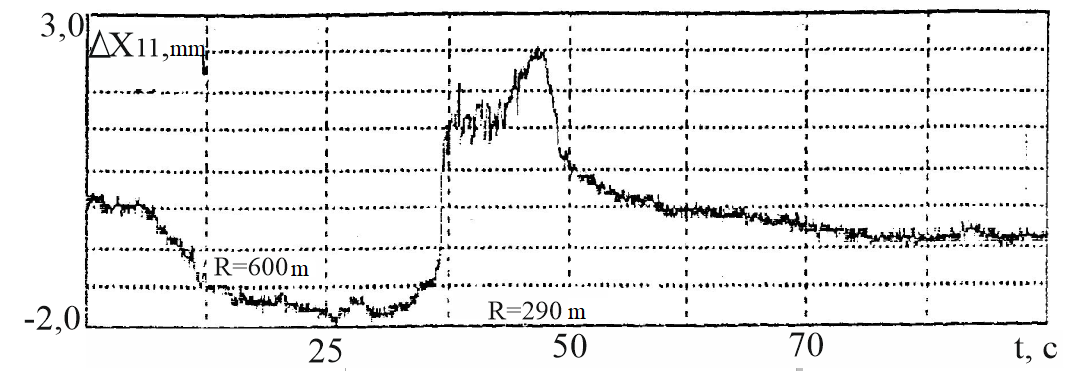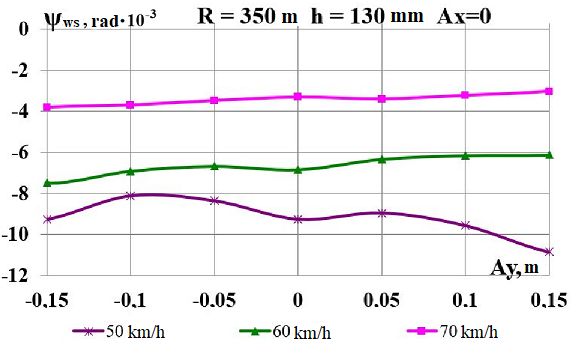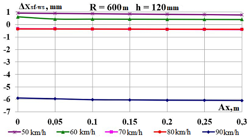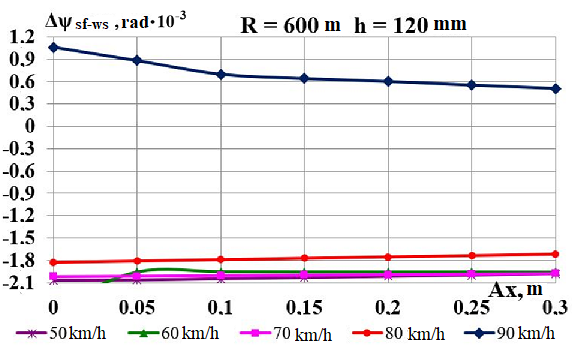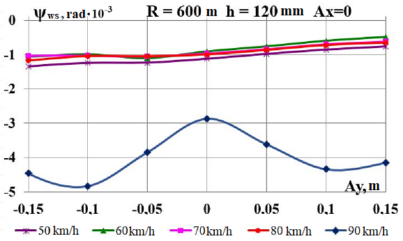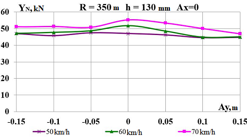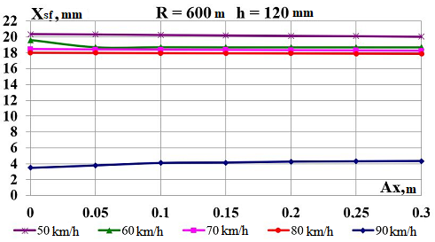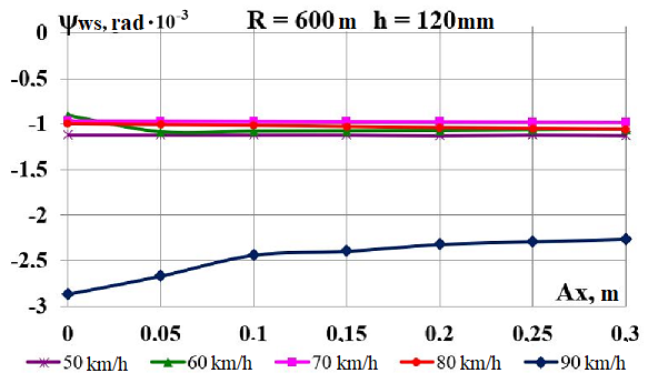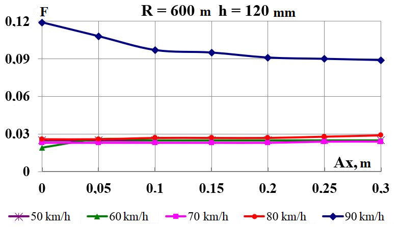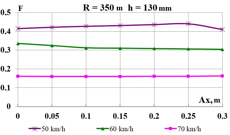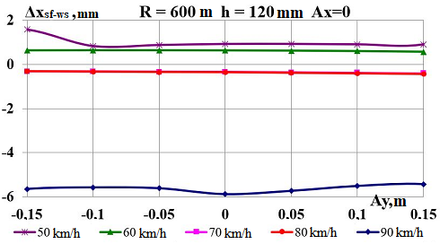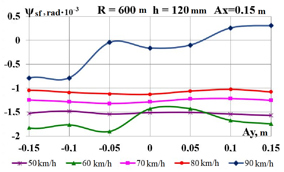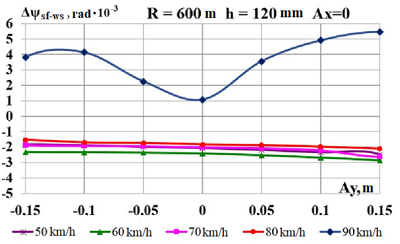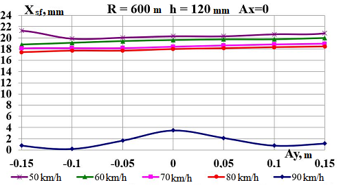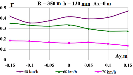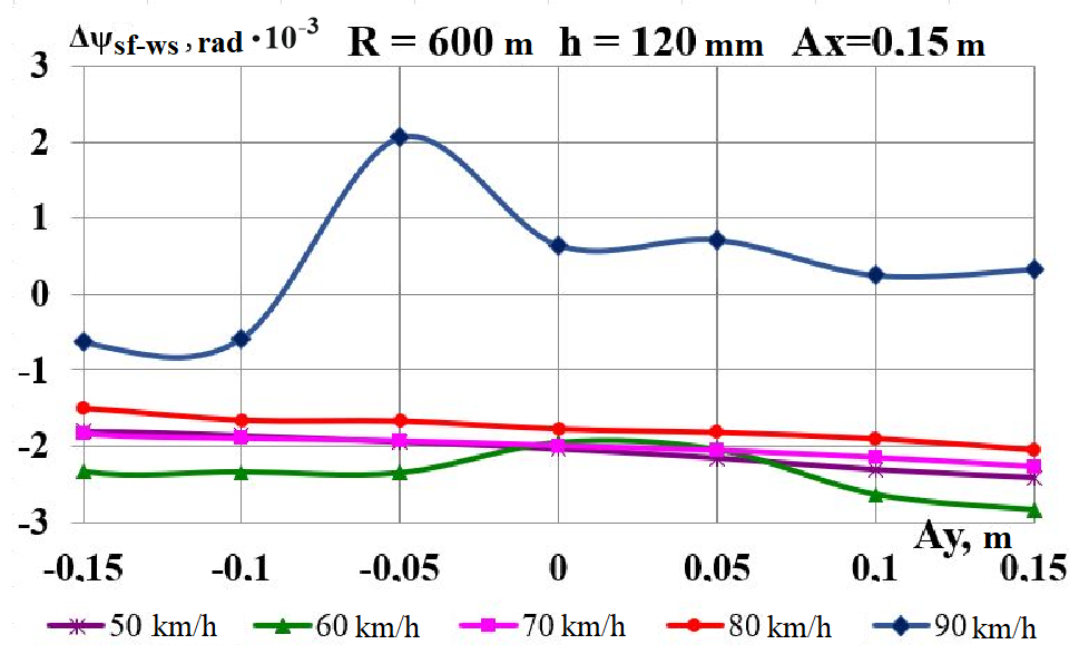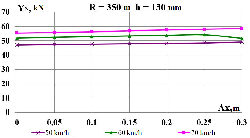 Цель. В научной работе нужно провести определение влияния несимметричной загрузки вагона-платформы на величину фактора износа пары «колесо–рельс» при изменении параметров, имеющих место в эксплуатации. Методика. Динамическую нагруженность вагона-платформы модели 13–401 с типовыми трехэлементными тележками исследовано с использованием модели пространственных колебаний сцепа из пяти вагонов с помощью математического и компьютерного моделирования. Теоретические расчеты выполнены для наиболее опасных участков железнодорожного пути-кривых малого и среднего радиуса в интервале допустимых скоростей движения. Результаты. Проанализированы показатели износа колес подвижного состава и рельсов на примере вагонов-платформ при наличии продольного и поперечного смещения центра масс груза относительно центра симметрии вагона. Для получения информации о влиянии допустимых отклонений расположения груза в вагоне на величину динамической нагруженности контакта «колесо–рельс» выполнены теоретические исследования пространственных колебаний рельсового экипажа и его взаимодействия с колеей. Научная новизна. Для определения износа пары «колесо-рельс» исследовано влияние смещения в двух направлениях от центральной оси симметрии центра тяжести груза с учетом величины скорости движения по кривых участках пути малого и среднего радиуса с применением математической модели сцепа из пяти грузовых вагонов. Практическая значимость. В результате проведенных теоретических исследований оценены такие показатели, как фактор износа, направленная сила и виляние колесной пары грузового подвижного состава в случае смещения центра тяжести груза при движении по криволинейным участкам железнодорожного пути. Для установления возможной причины интенсивного износа колес и рельсов проанализированы параметры: забегание боковых рам передней тележки; виляние левой боковой рамы передней тележки; взаимное продольное перемещение боковой рамы и буксового узла передней колесной пары; взаимное виляние левой боковой рамы тележки относительно передней колесной пары.