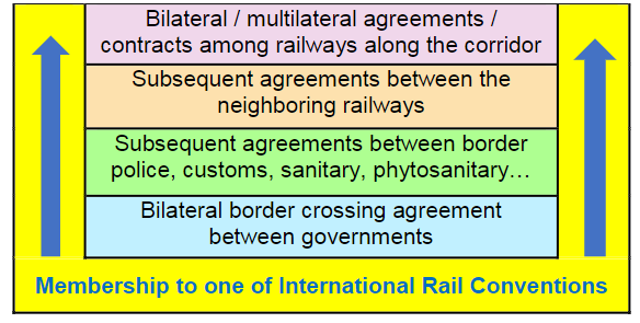 Collaboration is the highest level of decision making. It involves political alliances between heads of state, parliaments, and governments along the corridor. Cooperation is mutual support by ministries and agencies. Management refers to the effective running of the corridor. An agreement refers to any form of document, binding or not, that reflects the willingness and commitment of the parties concerned by the development of the corridor and endorsed by them, including a memorandum of understanding, a convention, a treaty, or other types of agreements [20]. Joining the existing international railway conventions is the only way to comprehensively address the legal issues of international rail transport across the entire continent and in relationship with Europe. After joining one of the existing international railways conventions, neighboring countries or all countries along a corridor may sign subsequent bilateral or multilateral agreements for joint implementation of their agreed up on obligations for managing international railway transport services, but only in the general framework established by the international convention they belong to [19]. Figure 2 presents schematically the cascade of agreements in their logical order: governmental agreements, agreements of state institutions involved in border crossing procedures, agreements of neighboring railways for handing over the train at border, agreements between railways along the corridor for providing joint transport services.
