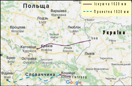 Сьогодні наявна ширококолійна мережа 1 520 мм фактично закінчується на східному кордоні Євросоюзу. Деякі ширококолійні коридори заходять на територію Євросоюзу, наприклад, з України до Катовіце в Польщі, з України до Захоні в Угорщині, і з українського міста Ужгород до Кошице і до Черна-над-Тисою в Словаччині (рис. 1, рисунок створено на основі відкритого використання Google Карт).