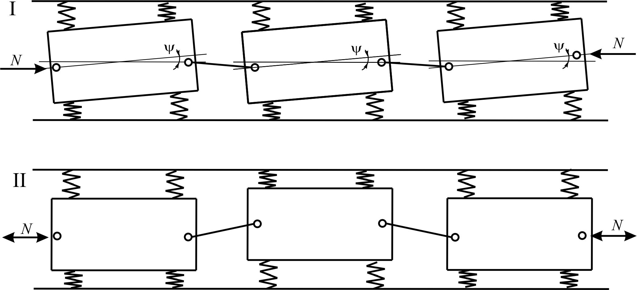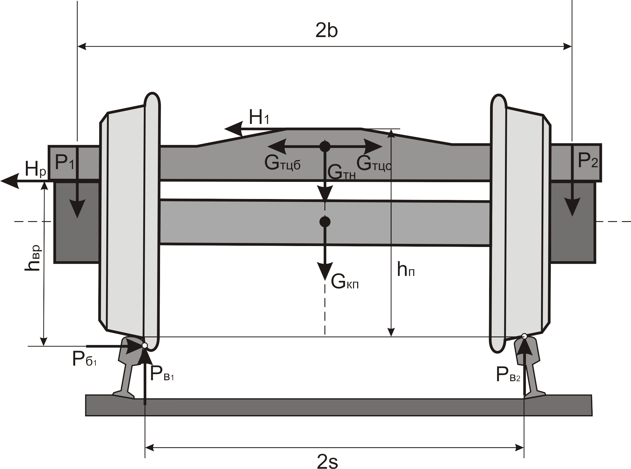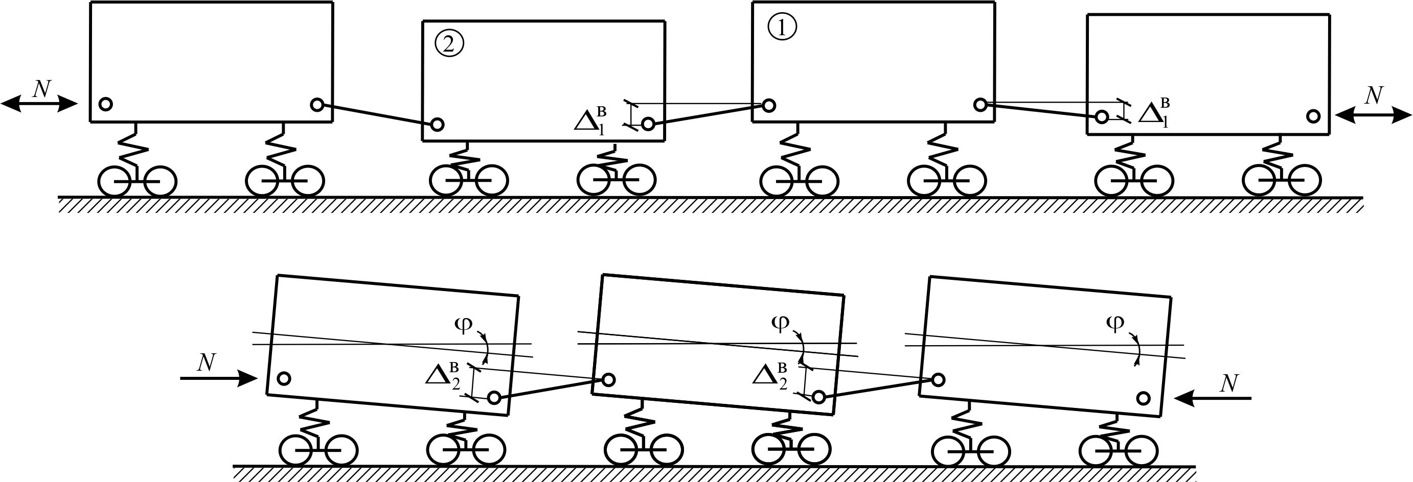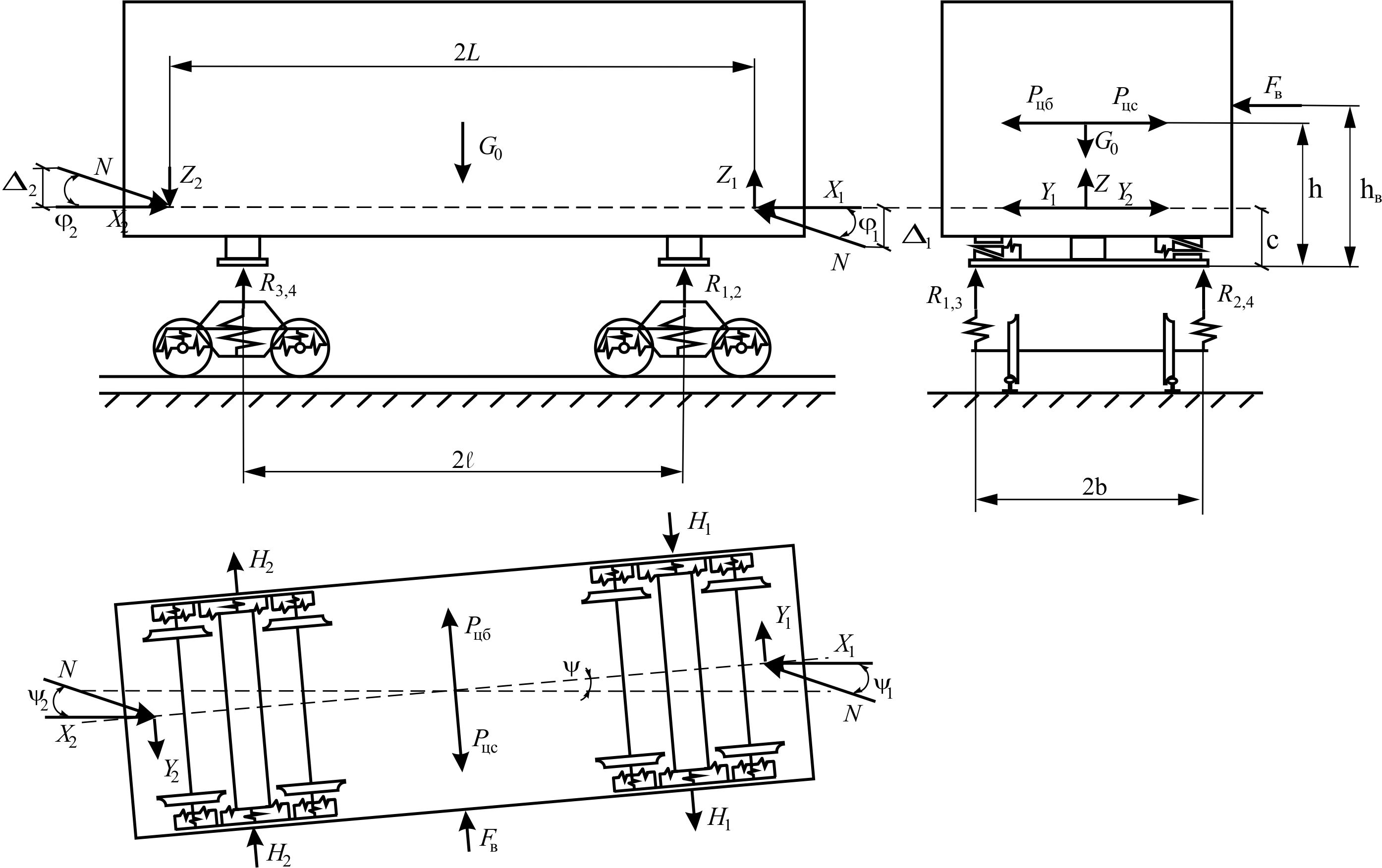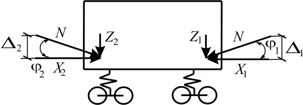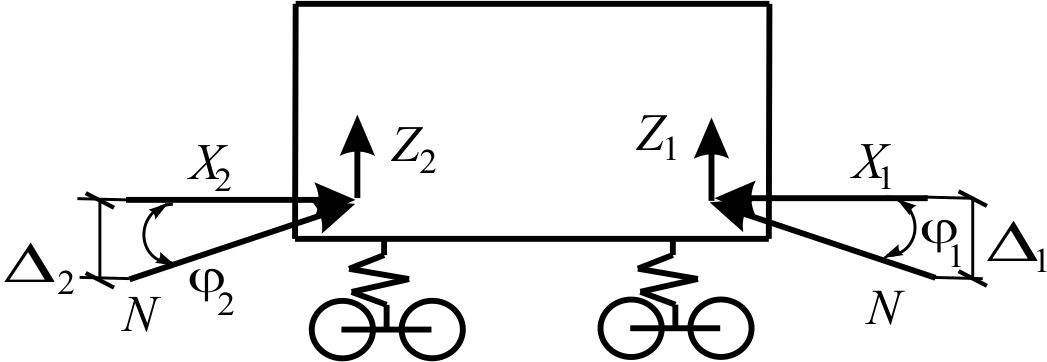Вибір розрахункових схем вагонів та поїзда визначається поставленим завданням і критерієм оцінки стійкості руху вагона [12, 16–18]. Крім того, розрахункова схема повинна враховувати можливість різних схем встановлення окремого вагона в рейковій колії залежно від сил стискання або розтягування на криволінійній або прямій ділянці. Розрахункова схема повинна також відображати особливості передачі поздовжніх сил на елементи візків у вертикальному й горизонтальному (поперечному) напрямках (рис. 1) [6, 8].