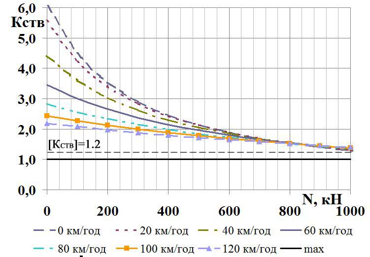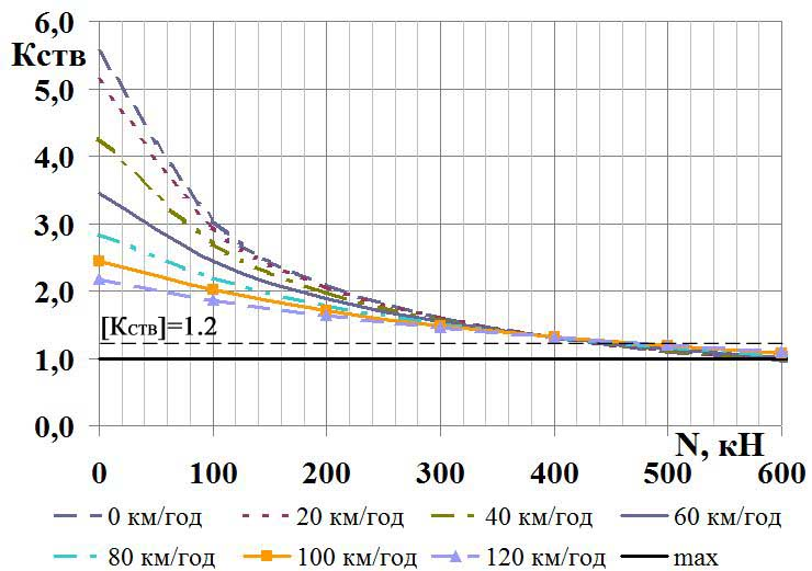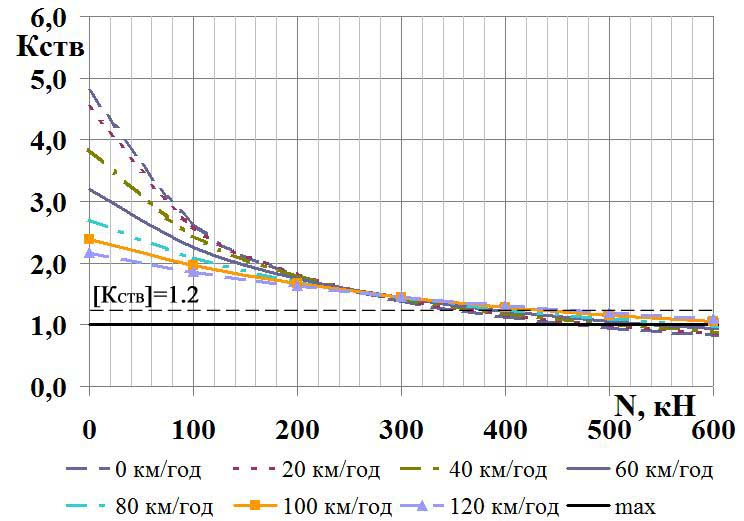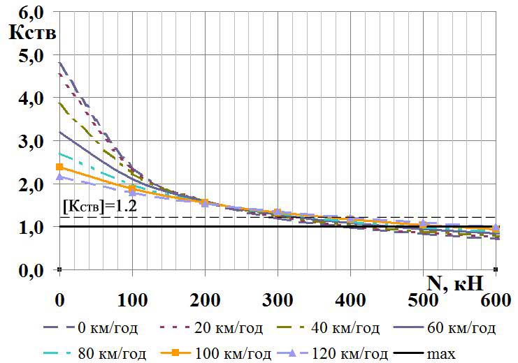 Основним критерієм оцінки динамічних якостей рухомого складу є критерій стійкості екіпажу проти сходження з рейок, що являє собою гранично допустиме відношення поперечних горизонтальних і вертикальних сил, які діють на набігаюче колесо. Не існує єдиної думки щодо того, яке відношення поперечних горизонтальних та вертикальних сил, що діють на колісну пару, слід брати за критерій стійкості екіпажа проти сходження колеса з рейок [8–10, 21].