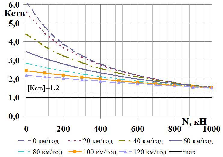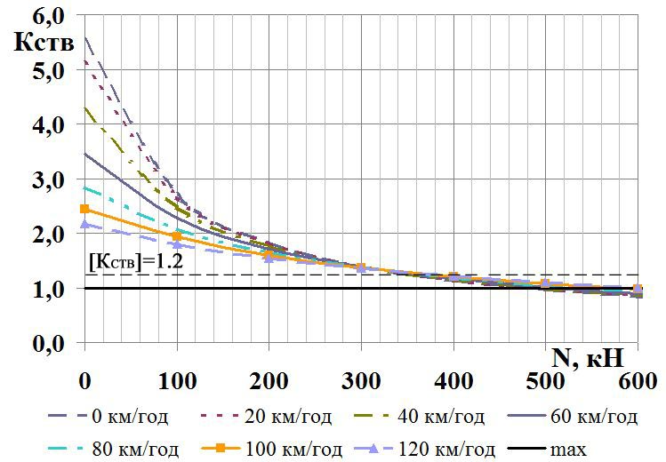 Забезпечення стійкості руху вагонів у довгосоставних вантажних поїздах підвищеної вантажопідйомності залишається актуальною проблемою протягом тривалого часу. Величини допустимих поздовжніх сил увійшли в нормативно-технічні документи, відповідно до яких усі нові спроектовані й побудовані вагони повинні відповідати умовам стійкості від витискання та скочування з колії. Ці документи також служать настановою під час організації руху довгосоставних вантажних поїздів підвищеної вантажопідйомності. Однак у процесі експлуатації виникає необхідність коригування нормативних документів, особливо в разі підвищення швидкості руху та скасування занадто жорстких обмежень на умови ведення поїздів [2, 4, 8, 19].