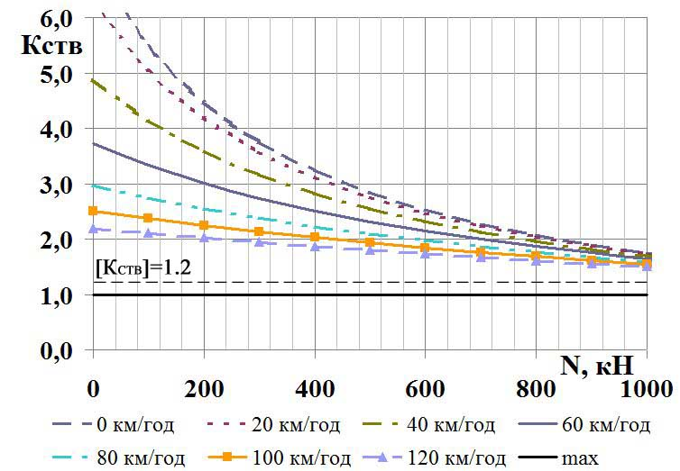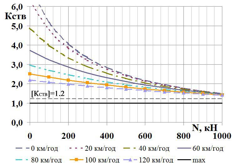 – у порожньому стані досліджуваний піввагон зберігає встановлений запас стійкості для вантажних вагонів під час руху з допустимою швидкістю в разі стискання силою в 550 кН за відсутності ексцентриситету закріплення хвостовика автозчеплення;